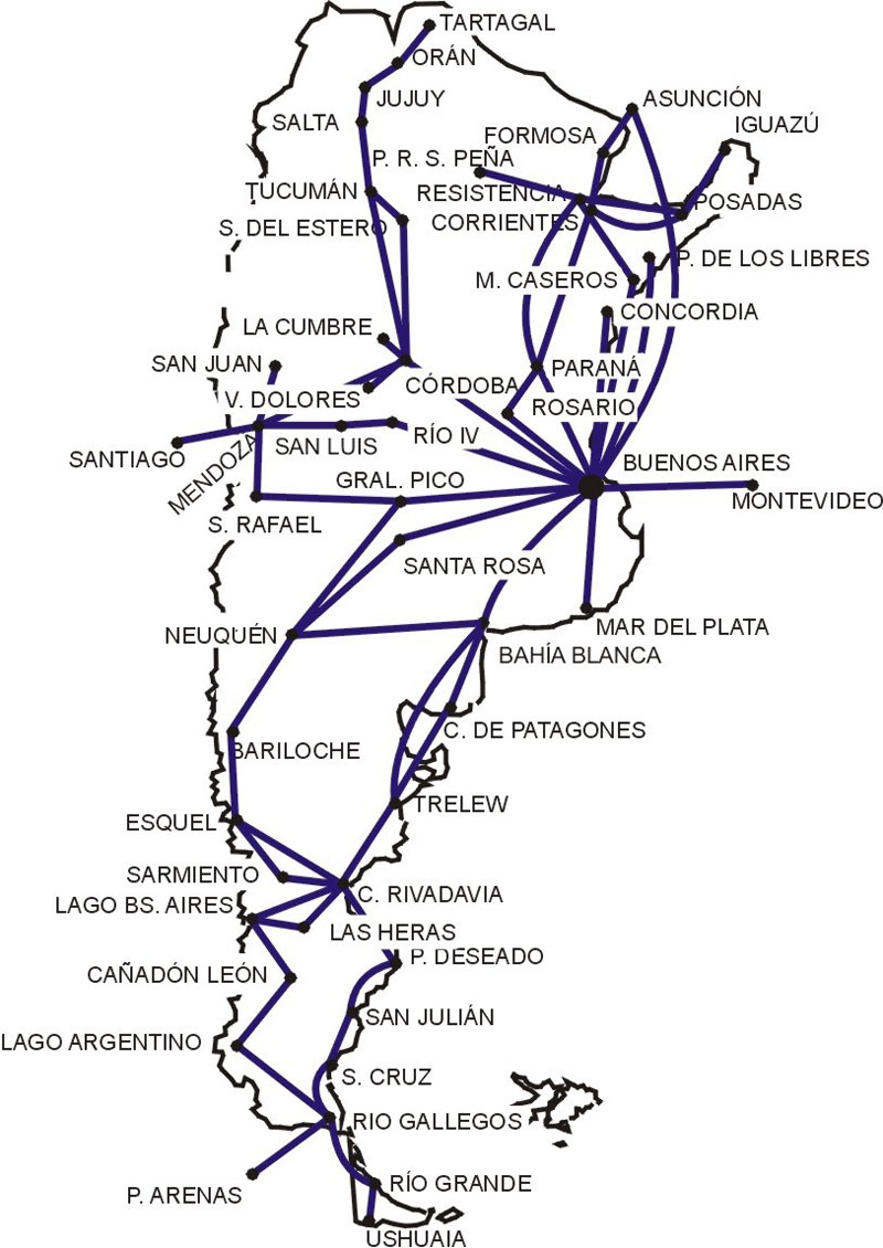 El mapa de rutas siguió más o menos como al principio, durante muchos años, y el criterio fue el mismo. Cuando en 1957 hubo una apertura del mercado a empresas privadas que, mayoritariamente, volaron desde la capital a ciudades importantes del interior.