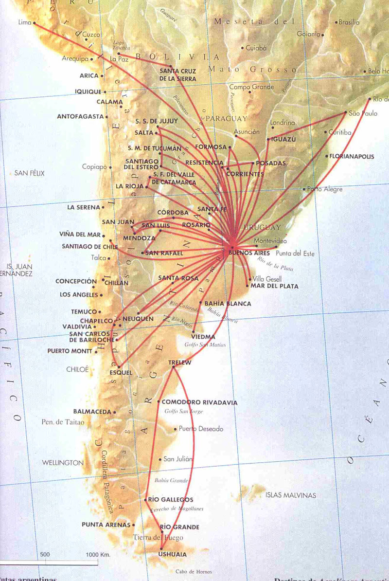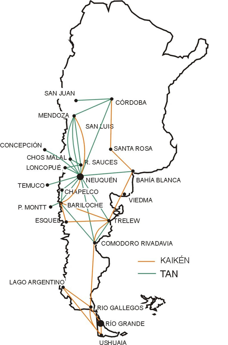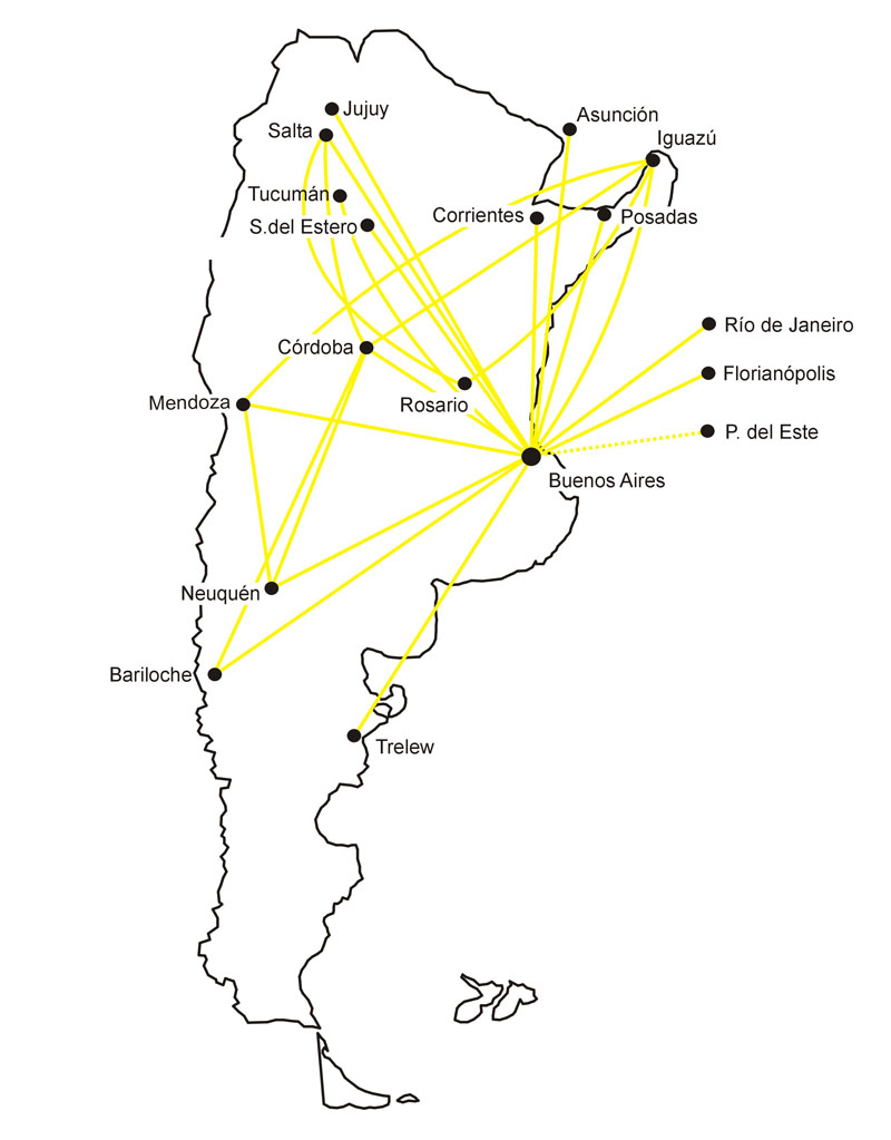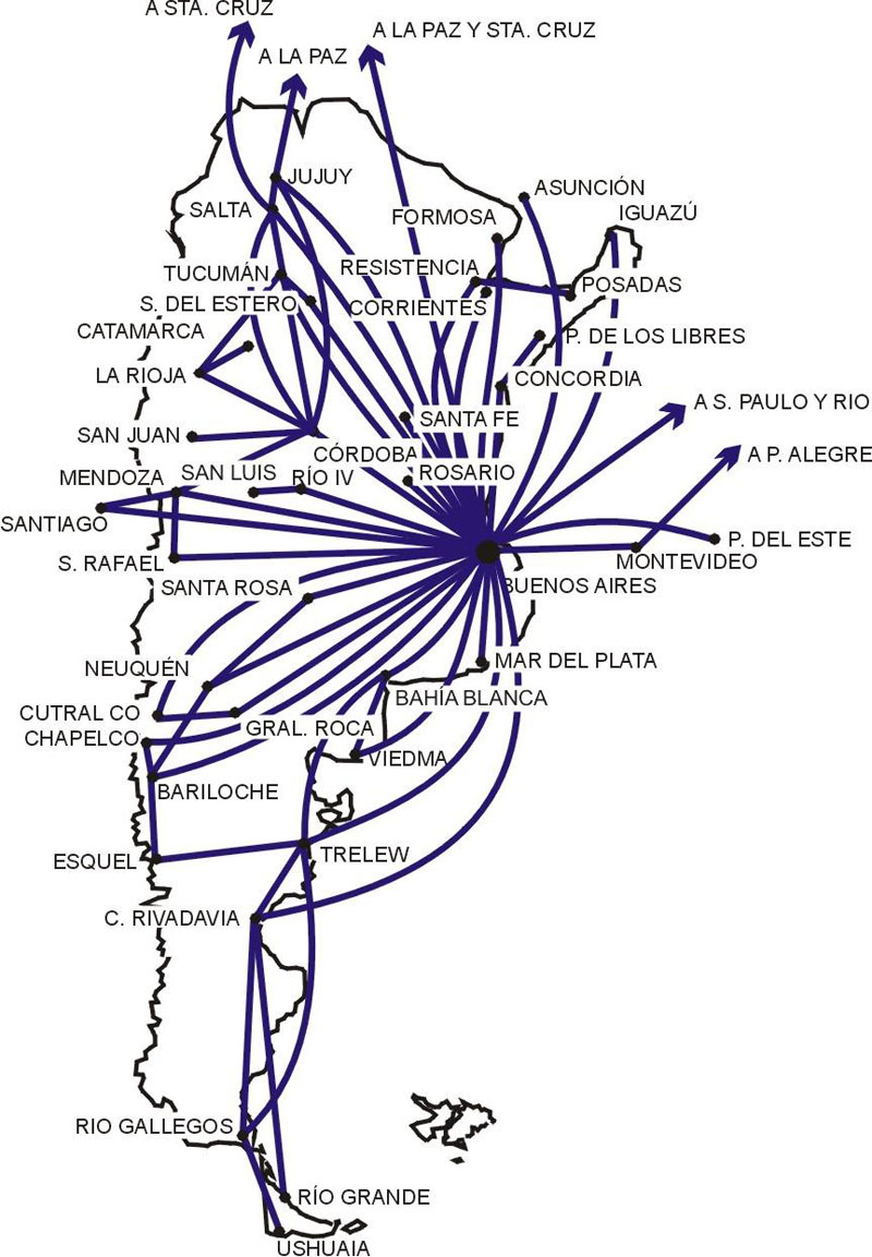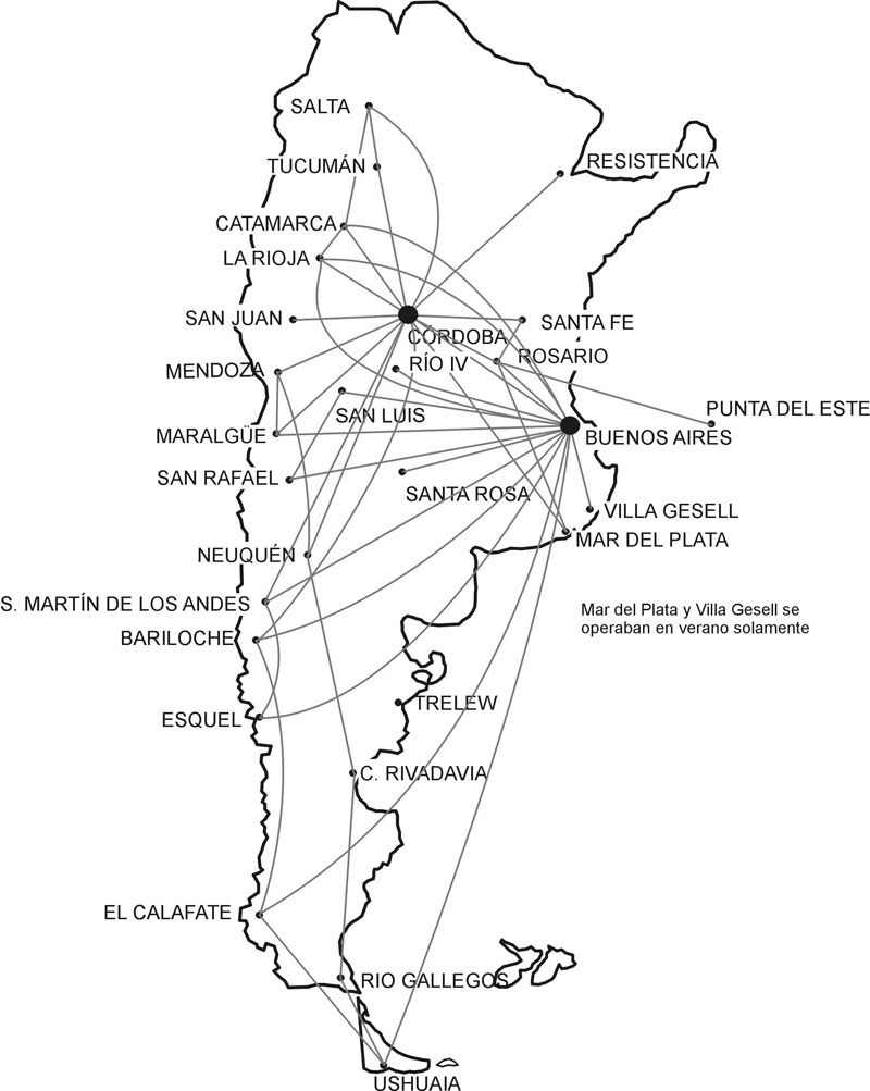 Lo concreto es que en ese momento la empresa volaba desde Buenos Aires a todas las capitales de provincia (menos Catamarca y La Rioja, reservadas a LADE) y tenía una red interprovincial no muy planificada, que permitía a los pasajeros volar entre algunas ciudades del interior utilizando escalas de trayectos centralizados.