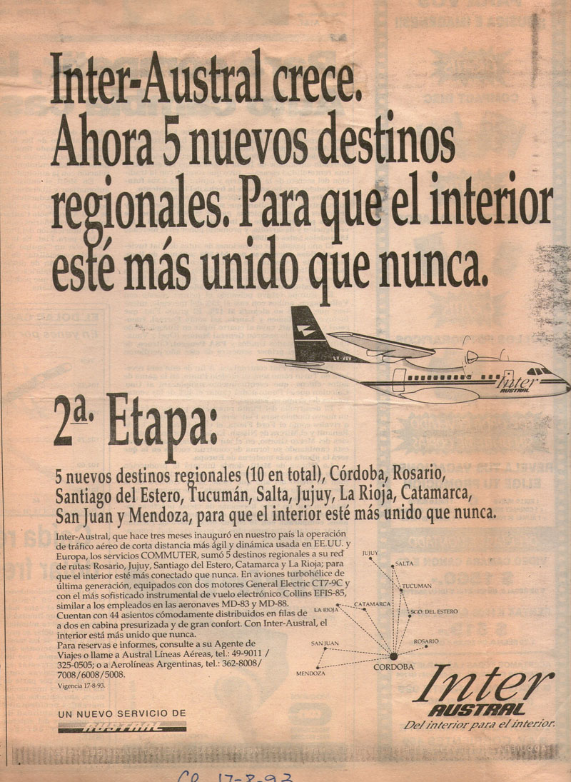 Pero durante este período hubo varias novedades. La primera fue que los españoles crearon, en 1993, una subsidiaria denominada Inter Austral, basada en Córdoba, que voló a Catamarca, Jujuy, La Rioja, Mendoza, Rosario, Salta, San Juan, Santiago del Estero y Tucumán. Utilizó dos aviones CASA 235 de 44 asientos, y dejó de operar de modo más o menos súbito, después de un accidente, en 1996.