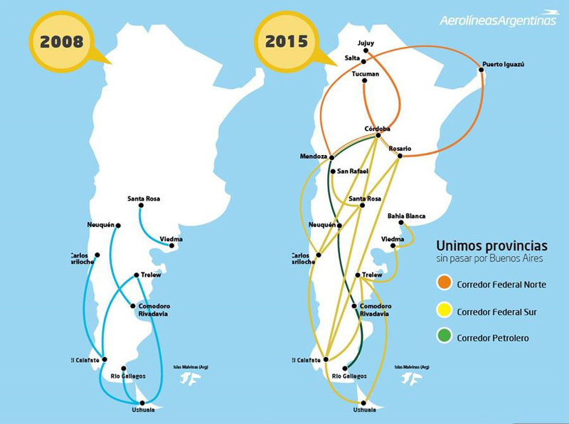 Argentina ha cambiado a lo largo de los setenta y un años que tiene Aerolíneas. Esto afectó a la evolución demográfica, las costumbres y los servicios. Parece increíble que las rutas aéreas internas no hayan cambiado mayormente y lleguen a menos destinos que en 1950.