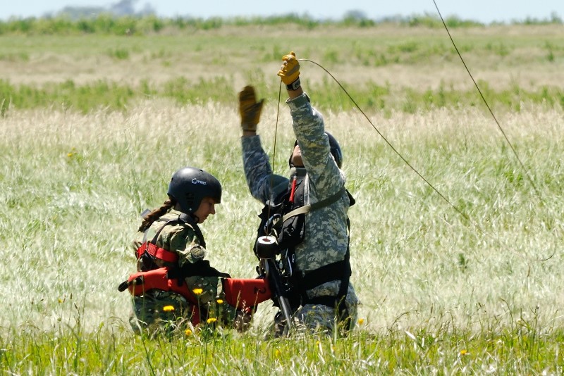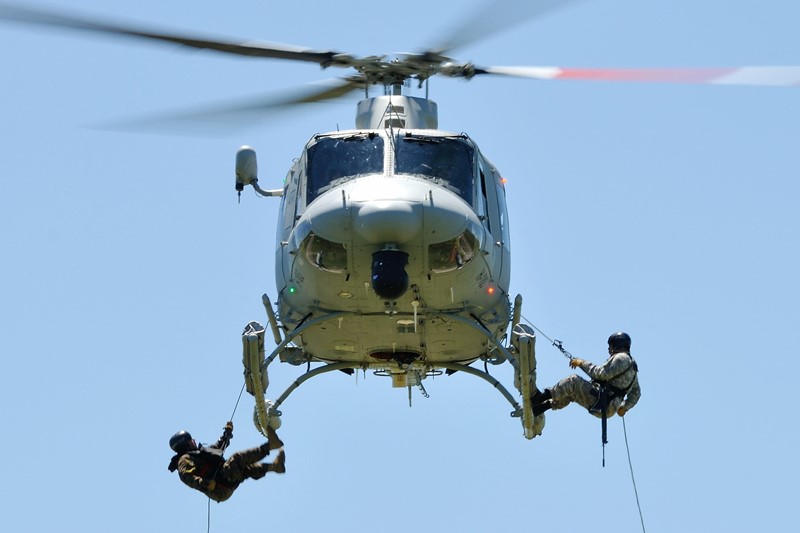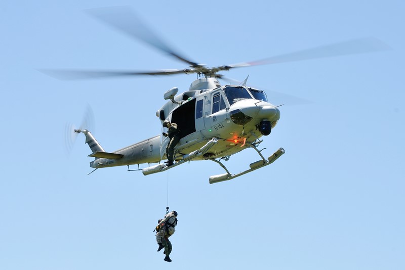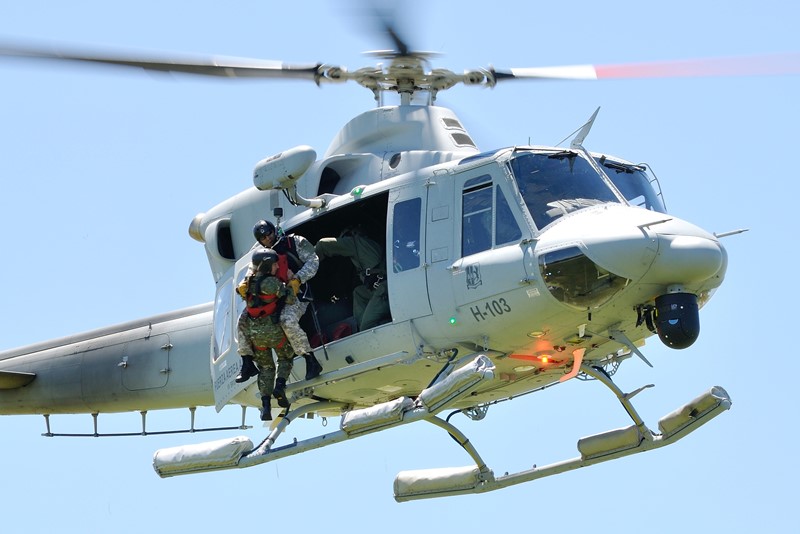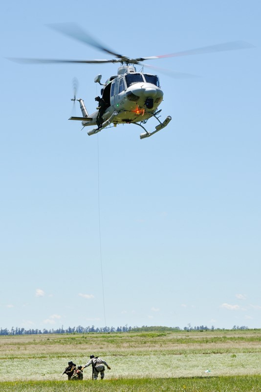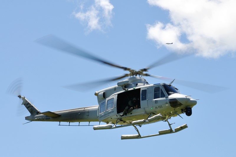 Ya en la plataforma, se producía la puesta en marcha y rodaje de dos de los IA-58A Pucará (A-588 y A-583) y del Bell 412EP (H-103) que participarían de la demostración para todos los presentes. Despegadas las tres aeronaves, estas procedían a la coordinación final a fin de iniciar las operaciones. Sobre el paño verde frente a la torre a distancia de seguridad, un piloto que sufriera su eyección tras líneas enemigas radia su posición y con sus coordenadas precisamente ubicadas marca su posición con una granada fumígena. El H-103 se desplaza hacia su área a fin de infiltrar personal del Grupo de Operaciones Especiales (GOE), que descendieron de la máquina en rappel a fines de identificar positivamente al piloto, proporcionarle asistencia médica en caso de ser necesario, al igual que proteger su integridad, para luego proceder a su extracción. Mientras que los Pucará proporcionaban cobertura aérea y batían cualquier tipo de oposición en tierra que hiciera peligrar la operación de rescate, y atentos a cualquier imprevisto en cada una de sus pasadas. Con la zona asegurada, el Bell 412EP vuelve a aproximarse a la zona para proceder a la extracción segura del personal eyectado y de la fracción de los GOE. Para ello, la máquina haría empleo de su cabría de rescate Goodrich 42325, con una capacidad máxima de izado de 272,15 kg. Con todo el personal abordo, la aeronave tomaba altura abandonando la zona de operaciones. El ejercicio había finalizado exitosamente.