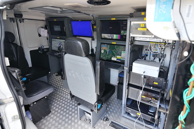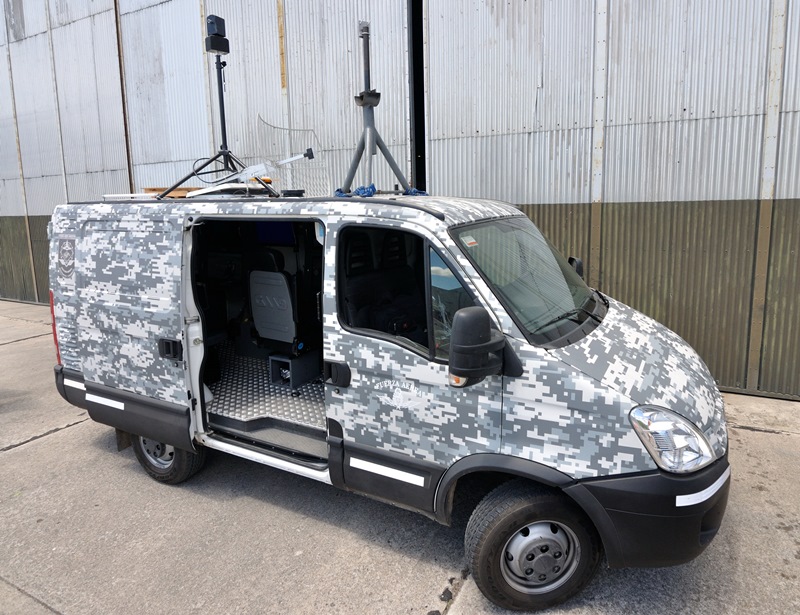 Luego de ello nos dirigimos frente al Hangar 4, donde allí encontramos expuestos dos ejemplares de los UAV «Aukan» y dos de los «Vigía 2B» y su Estación de Control Terrestre (ECT) móvil, emplazada en un vehículo Iveco Daily Furgón. Este vehículo cuenta con acomodo para todo el personal que participa en su operación remota: Piloto, Operador de Sistemas y Comandante de Misión.