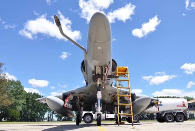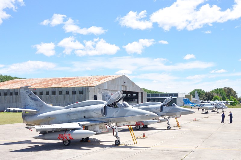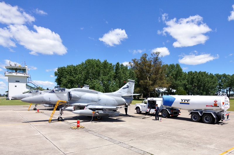 Siguiendo con las actividades previstas para los medios presentes, nos desplazamos hacia la plataforma frente al Hangar 2, donde allí se encontraban alineados tres IA-58A Pucara (A-588, A-583 y A-575,) un KC-130H Hercules (TC-69) y comenzaban a alistarse dos A-4AR Fightinghawk (C-908 y C-926). Ambos ejemplares en sus estaciones subalares internas 2 y 4 llevaban sendos tanques lanzables Aero 1D mientras que en las subalares externas 1 y 5 los rack de misiles LAU 7/A. En uno de los ejemplares expuestos, se encontraba instalado un CATM-9L/M Sidewinder para el propósito de entrenar en maniobras de intercepción y de combate aéreo.