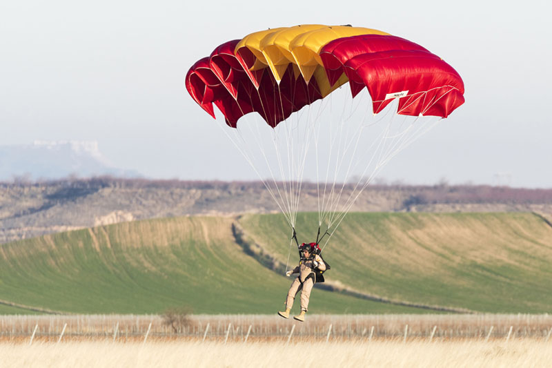 Primer plano de uno de los paracaidistas del EADA a punto de tomar tierra (foto: José Luis Lezg).