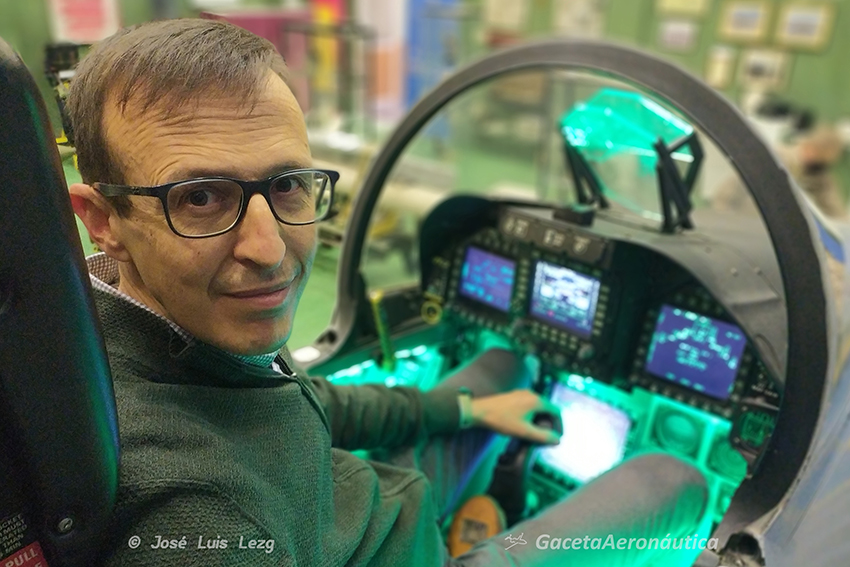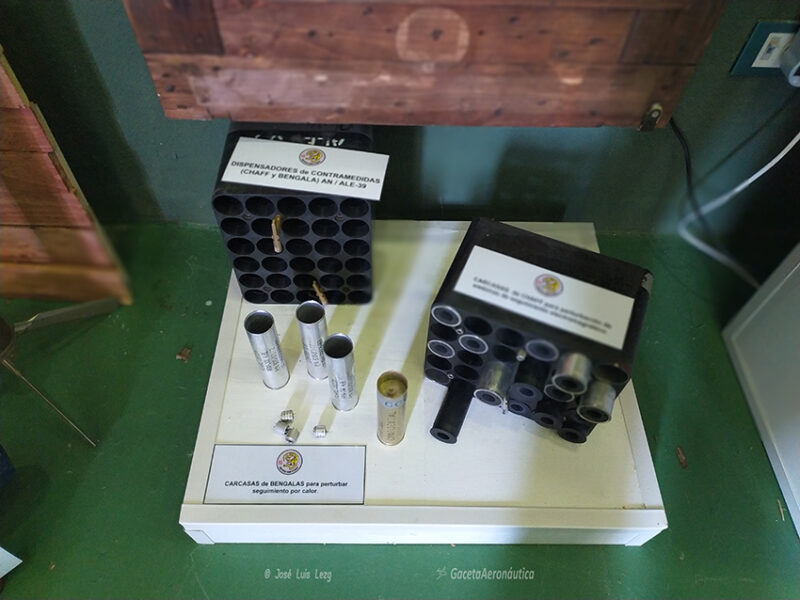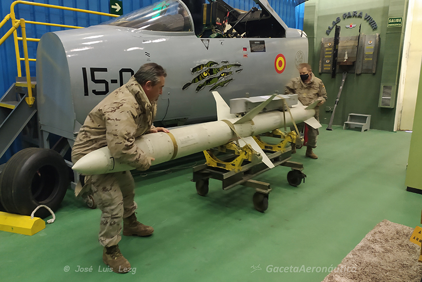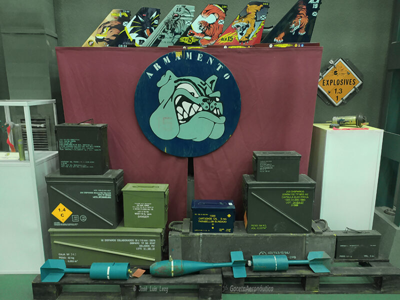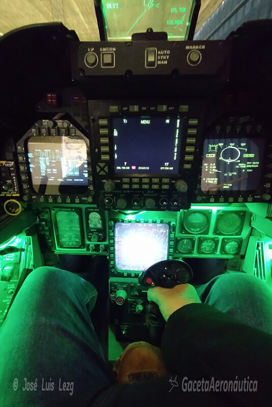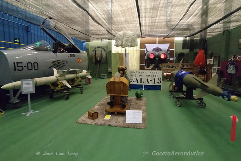 En el centro de la estancia se encuentra una genial réplica en madera del puesto de vuelo del EF-18 con un maniquí dotado del equipo de vuelo a los mandos. Al lado izquierdo del piloto una imponente GBU-10 (Mk-84) de 1000 Kg y a su derecha un AGM-88 HARM (los dos fueron empleados por el Ala 15 en la Guerra de la antigua Yugoslavia). Al lado del HARM tenemos un magnífico emulador de la cabina de vuelo del Hornet con las pantallas iluminadas y con proyecciones en bucle en el que podemos subirnos y sentirnos por unos momentos pilotos de este espectacular cazabombardero.
