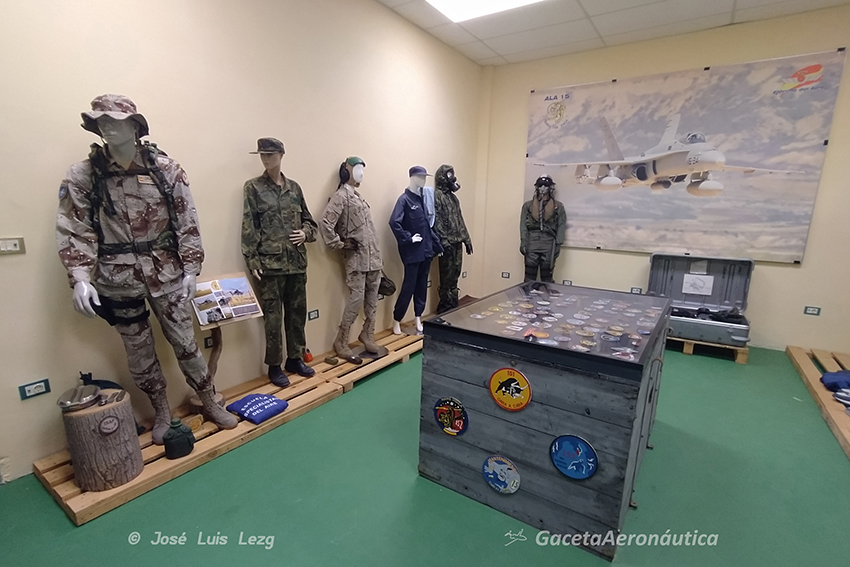 Vemos una dependencia dedicada a los diversos uniformes, útiles y emblemas que ha portado el personal del Ala 15, con maniquís vestidos con trajes de aeródromo, de invierno y de verano, azules de faena, con camuflaje boscoso o árido, NBQ, de piloto con todo su equipo, de destacamentos y trajes de paseo (de bonito).