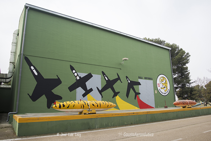 Gaceta Aeronáutica ha tenido la oportunidad de visitar la Sala Histórica del Ala 15. Ya la entrada del edificio promete que vamos a ver algo interesante. Nos encontramos con una fachada en la que están dibujadas las siluetas de los cuatro reactores que ha tenido la Base Aérea de Zaragoza, el F-86F Sabre, el T-33 Shooting Star, el C-101 Aviojet y el EF-18 Hornet y por sus toberas salen los colores de la Bandera de España adornando el edificio.