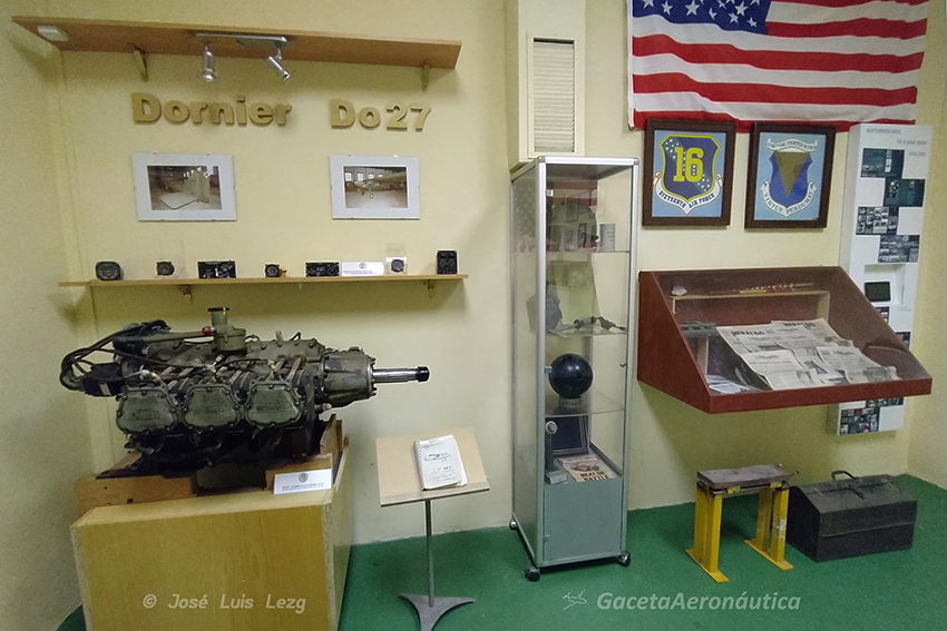 En la misma sala podemos ver un motor, un manual de vuelo, fotografías y diversos relojes y componentes de una Dornier Do-27. En España se fabricaron 50 ejemplares bajo licencia por CASA denominadas C-127 que se fueron recibiendo a partir de 1960. En 1973 se compraron 26 Dornier Do-27 más procedentes de la Luftwaffe y del Ejército de tierra alemán. Cabe señalar que las Do-27 fueron el primer avión que entró en producción en Alemania tras la Segunda Guerra Mundial.