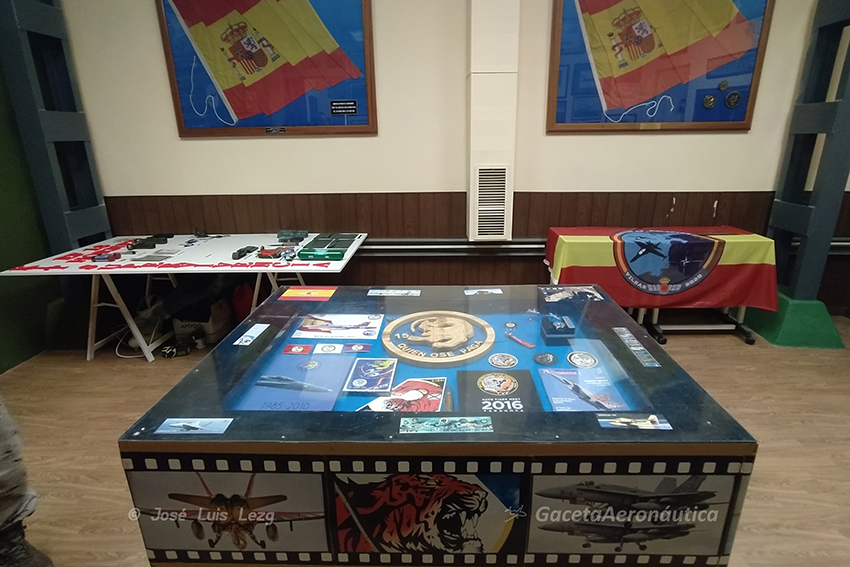 En toda la estancia podemos ver vitrinas con recuerdos del Ala 15, desde sus primeros tiempos en 1986 hasta la actualidad. Una serie de réplicas de las derivas decoradas de EF-18, ,bombetas de prácticas, cajas de munición, lanzadores de bombas MER, una percha de abastecimiento a punto de introducirse en la cesta del tanker, lanzadores de chaff y bengalas y un asiento eyectable de EF-18 en el que en su día hubo de eyectarse su piloto