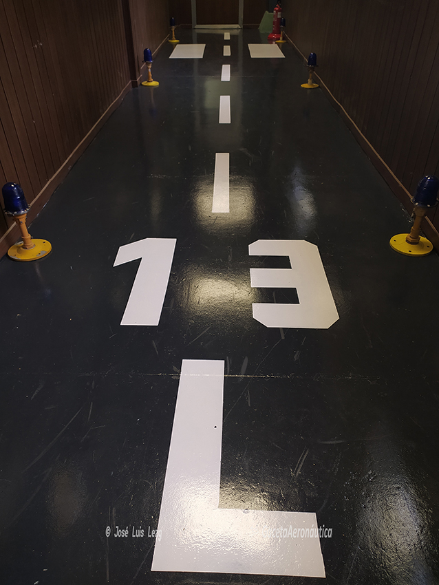 Seguimos por un pasillo que con mucho gusto y acierto ha sido tuneado para que parezca una pista de aterrizaje con sus correspondientes luces a los lados y también con el nombre 13L que en aquel tiempo tenía una de las pistas de la base. Por las paredes diferentes recuerdos, placas conmemorativas de fechas e hitos importantes del Ala 15, también regalos y metopas de unidades con las que se han hecho intercambios y ejercicios conjuntos. Sobre nosotros y a lo largo de todo el pasillo el techo luce los colores rojo y gualda de la enseña nacional.