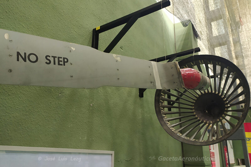 Al fondo de la sala hay una fotografía a tamaño real de la parte trasera del avión, a la que se le han colocado unas toberas reales y se ha simulado el espectacular chorro de fuego que se produce con la postcombustión.