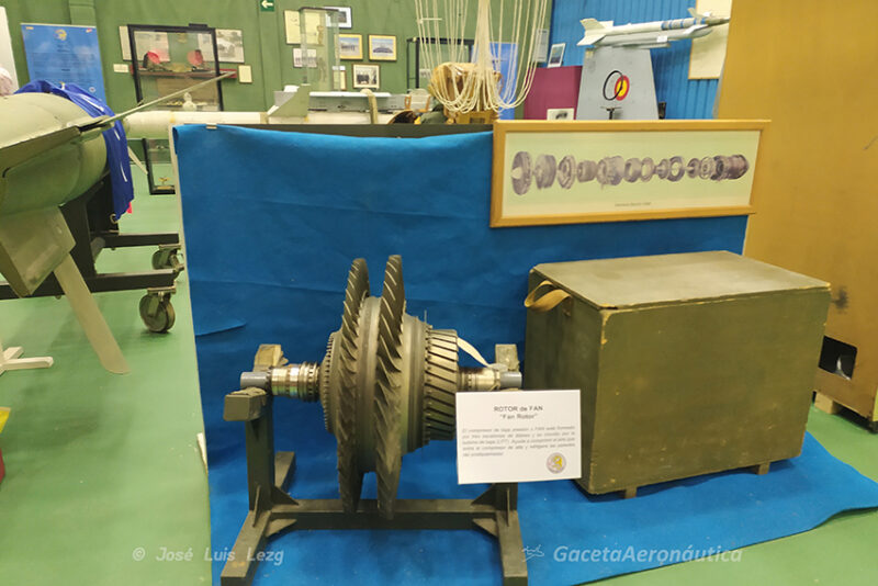 A su lado un rotor de fan proveniente de un motor General Electric F-404 que impulsa al EF-18, montando dos de estos motores. Un extremo de ala de Hornet desde la parte abisagrada (el ala del F-18 es plegable debido a su uso en portaaviones) que luce la escarapela nacional y en punta de plano porta un misil Infrarrojo AIM-9L.