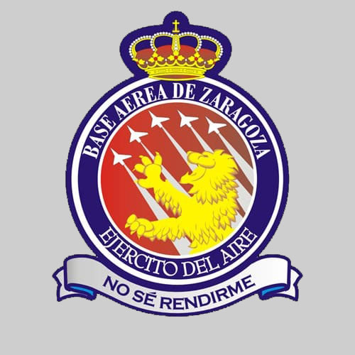 El distintivo se trata de un escudo redondo con corona en el que, sobre un fondo rojo, un busto de león de oro, símbolo de la ciudad de Zaragoza que representa las virtudes del valor y la fuerza, ocupa dos terceras partes del escudo dejando un espacio superior en el que cinco siluetas de aviones surcan el fondo dejando estelas plateadas.