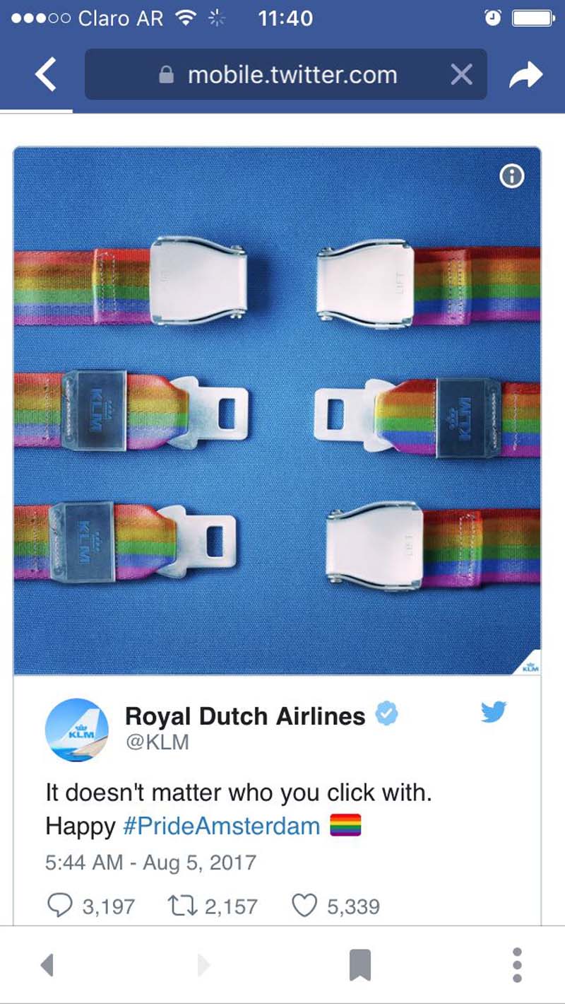 Y KLM, en 2017, adhirió a la marcha del orgullo en Amsterdam en sus redes sociales.