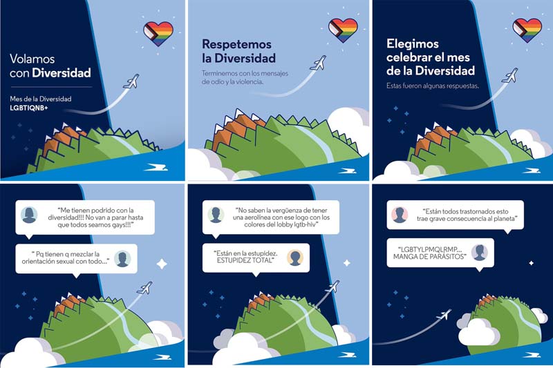 En noviembre de 2021, finalmente, Aerolíneas hizo una campaña de adhesión a la marcha del orgullo, formada por imágenes antagónicas.