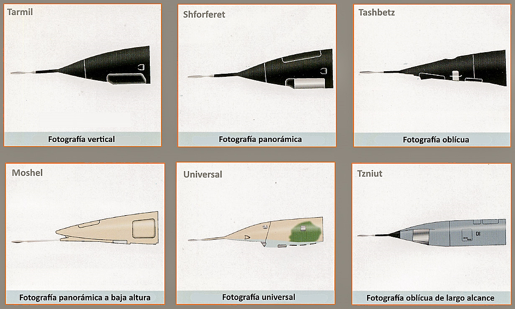 Cumplieron sus misiones con «narices» intercambiables, incluido el «Tarmil» (Bolsa) para altitudes medias y el «Tashbetz» (Crucigramas), que contenia cámaras estadounidenses ICON HR-231 para altitudes de 12,000 pies a 50,000 pies (4,000 metros a 15,000 metros), el “Moshel” (Gobernador) para bajas altitudes y el “Universal” para fotografía de diferentes clases, las cuales eran largas y dificultaban un poco más de lo habitual las maniobras de aproximación y aterrizaje final de estos cazas de alas delta.
