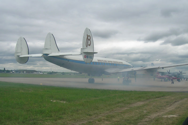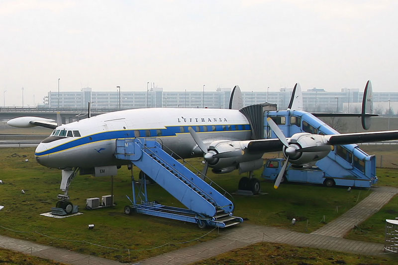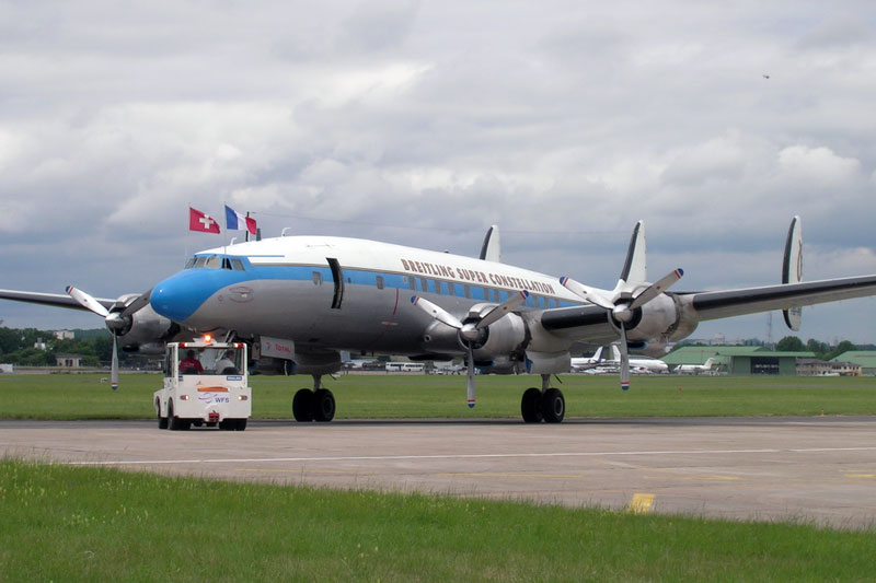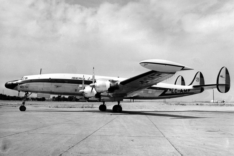 El Lockheed L-1049, también conocido como “Constellation” y por “Connie,” fue fabricado entre 1943 y 1958 en la planta de Burbank (California), alcanzando las 856 unidades. Propulsado inicialmente por cuatro motores Wright “Cyclone” 972TC, y R3350 de 18 cilindros, en doble estrella, tenía una autonomía de 9400 Km, una longitud de 34,65 metros, una envergadura de 37,49 metros, una velocidad máxima de 596 Km/h y una configuración de 59 a 99 plazas, siendo inconfundible por su triple deriva y su fuselaje con forma de delfín.