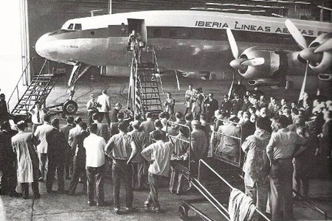 La línea aérea de bandera española recibió el primer aparato en junio de 1954, realizando el vuelo inaugural el tres de agosto en la ruta entre Madrid y el aeropuerto de Idlewild, en Nueva York (hoy conocido como JFK) con escala en Azores transportando 53 invitados, precisamente el mismo día que Cristóbal Colón partiera del Puerto de Palos rumbo a las Américas 462 años atrás.