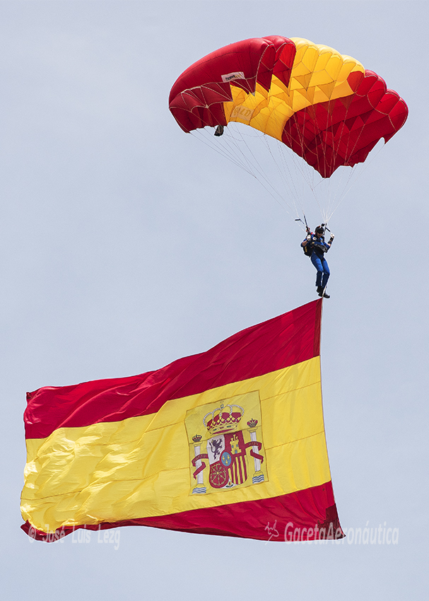 El primer saltador iba tan solo con su paracaídas y ha ido sirviendo de guía a su compañero que tras él portaba la Bandera amarrada a su pierna izquierda.