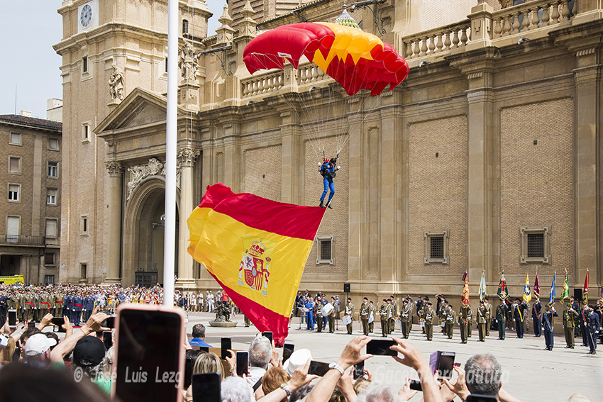 El pasado sábado día 21 de mayo de2022, tuvo lugar un salto paracaidista de la mano de la Patrulla Acrobática de Paracaidismo del Ejército del Aire (PAPEA) en la Plaza del Pilar de Zaragoza. Para seguidamente proceder al izado de la Bandera de España con motivo de la celebración del Día de las Fuerzas Armadas.