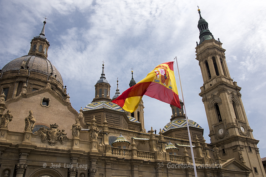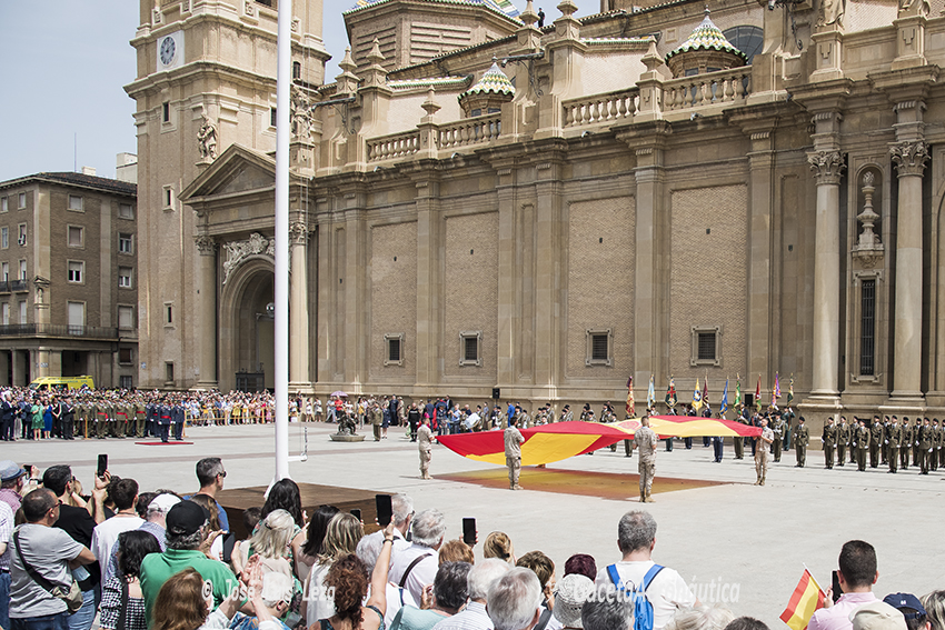 Tras tan vistoso salto paracaidista el público asistente ha recibido la Bandera con ovaciones y aplausos y se ha procedido al “Izado Solemne” de la Bandera de España (en este caso una de 12 metros cuadrados). En otras ocasiones el Izado Solemne se ha efectuado en la Plaza de España y a muy primeras horas de la mañana, pero en esta ocasión se ha realizado en la emblemática Plaza del Pilar que todos los zaragozanos consideramos como el Patio de Zaragoza. Esta Plaza es el punto de reunión de los habitantes de la ciudad del Ebro y centro de las atenciones de todos los turistas que la visitan. En ella se celebran las campanadas de la noche vieja, el pregón de fiestas, los acontecimientos deportivos y es testigo de mercadillos medievales que engalanan todos los alrededores con pendones y estandartes.