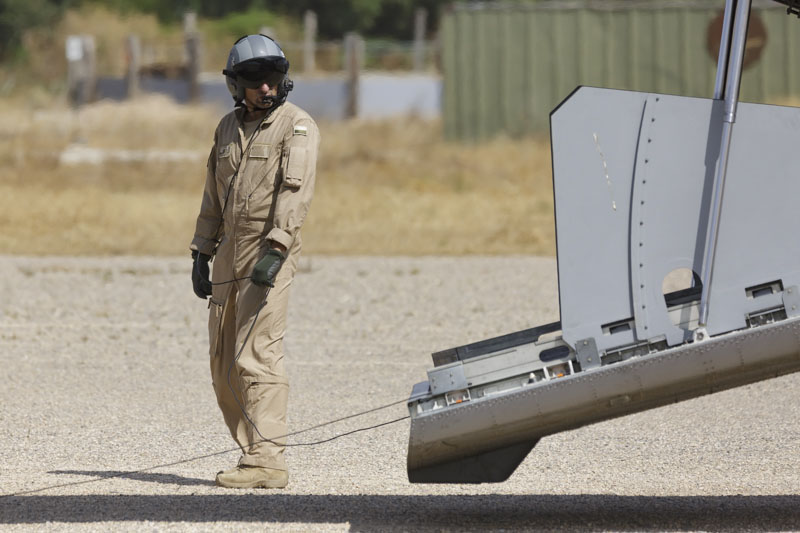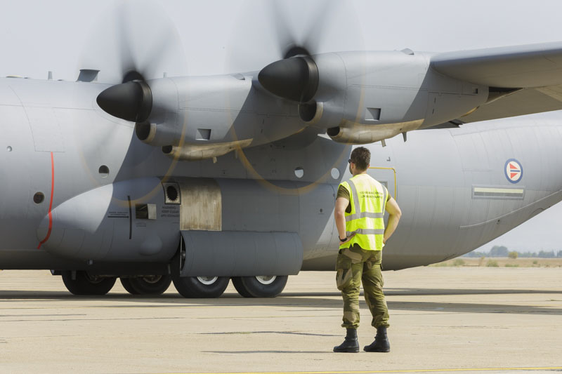 Ablitas, 13 de Septiembre de 2018: La actividad en el aeródromo es frenética, los CCT (Equipos de Control de Combate) del EADA realizan las últimas comprobaciones del estado de la pista, el personal sanitario proveniente de la Base de Zaragoza se prepara y los integrantes del equipo contraincendios toman posición junto a la plataforma. El personal del ACAR Bardenas, del que depende el aeródromo, mantiene las instalaciones constantemente preparadas y en estado de total disponibilidad. Hoy es el último día de vuelo del ETAP-C 2018-4, es el examen final, la reválida en la que todas las tripulaciones y personal de apoyo van a poner a prueba las enseñanzas recibidas durante las dos semanas anteriores. En esta jornada los aviones realizarán tomas y descargas de combate, los tiempos están medidos, no hay espacio para la improvisación, los procedimientos que se han entrenado una y otra vez hacen que todo ocurra de forma rápida y fluida.