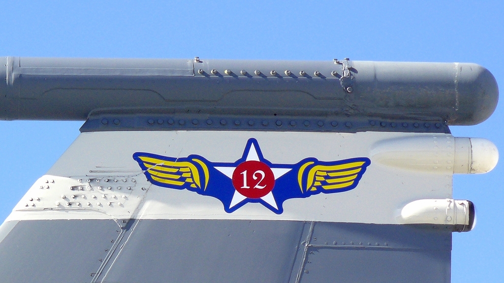 Los elementos más llamativos, sin embargo, son dos contenedores subalares negros profusamente decorados con insignias del general Seip, la 12th AF y el ACC.