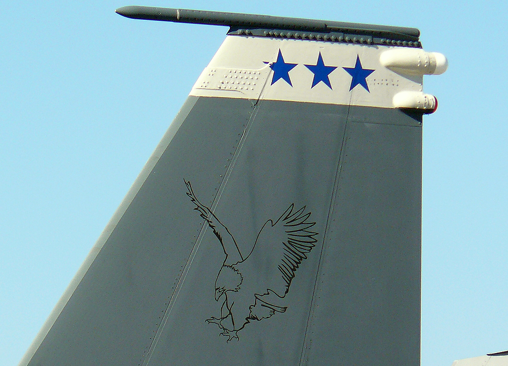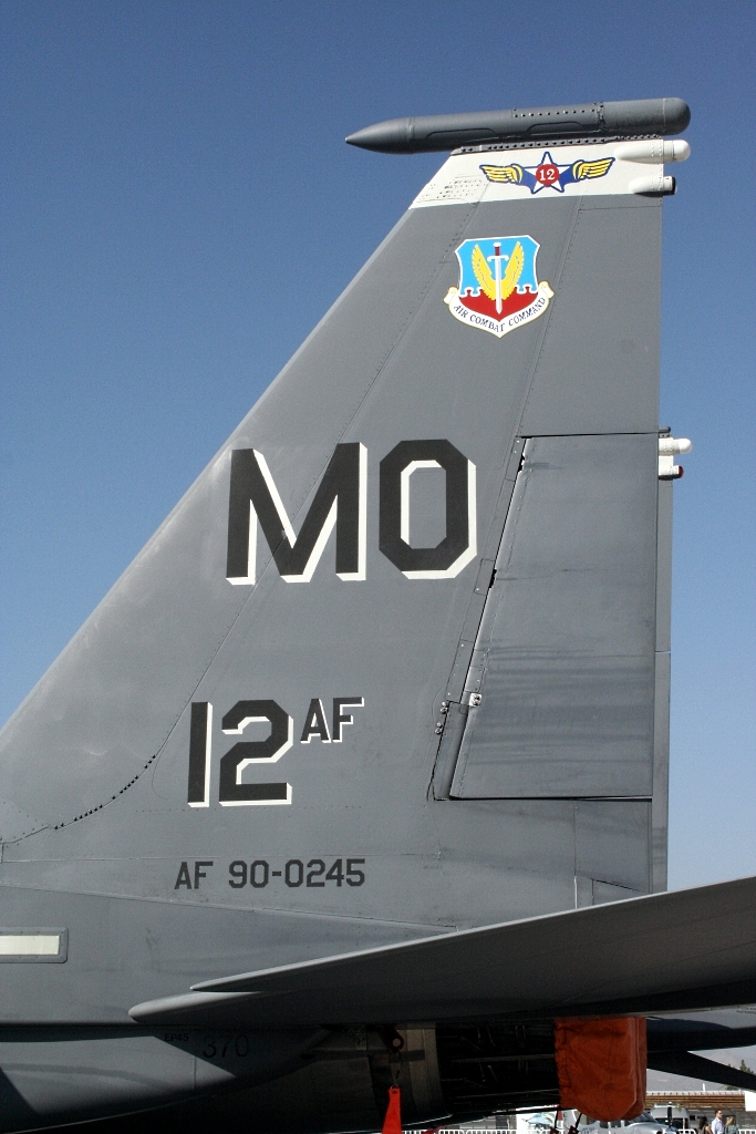 En la cara externa de ambas derivas, nuestro ejemplar exhibe (de arriba hacia abajo) una banda blanca con el emblema alado de la 12th AF, el escudo del Comando de Combate Aéreo (Air Combat Command o ACC), el código de base aérea «MO» (Mountain Home, su asiento en tiempos de paz), la leyenda «12 AF» y su número de serie (90-0245).