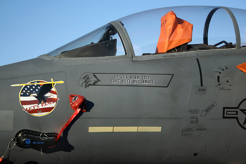 En los costados del cockpit se aprecian los nombres de los responsables de operar este aparato: Teniente general Norm Seip (piloto), capitán Pete McCormick (operador de sistemas), cabos primeros (staff sergeants) Benjamin Truex y Matthew Rettig (encargados en línea de vuelo).