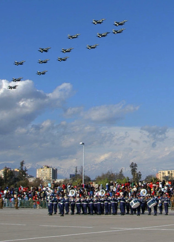 El capítulo aéreo estuvo enteramente a cargo de la FACH, que inició su presentación con un pasaje de la Escuadrilla de Alta Acrobacia “Halcones”, liderada por el capitán Raúl Mera Vargas. La siguieron 15 entrenadores T-35 Pillán de la Escuela de Aviación «Capitán Manuel Avalos Prado», al mando del subdirector del instituto, comandante Albert Widmer Thomas. A continuación, seis Mirage 50 Pantera del Grupo de Aviación No.4, liderados por el comandante Cristián Pizarro Stiépovich, sobrevolaron la elipse en la que constituyó la última parada militar del modelo ya que el Pantera pasará a retiro el próximo 31 de diciembre tras la completa activación del sistema de armas F-16. Fueron aparatos de este último modelo, precisamente, los que integraron la siguiente célula del desfile aéreo: Una formación de 15 aparatos compuesta por seis F-16C/D del Grupo de Aviación No.3 y 9 F-16AM/BM del Grupo de Aviación No.8 liderada por el coronel Eduardo Mann Pelz. Mientras en tierra desfilaba el escalón terrestre de la FACH, del cual destacamos la presencia armada del Regimiento de Artillería Antiaérea y Fuerzas Especiales conducido por el coronel Javier del Río, en el cielo se presentó una formación de seis UH-1H Huey del Grupo de Aviación No.9 a cargo del comandante Fernando Sánchez Caballero. El cierre del escalón aéreo estuvo a cargo de cuatro F-16AM del Grupo 8 conducidos por el comandante José M. Aguirre Gamboa, que realizaron un pasaje a alta velocidad.