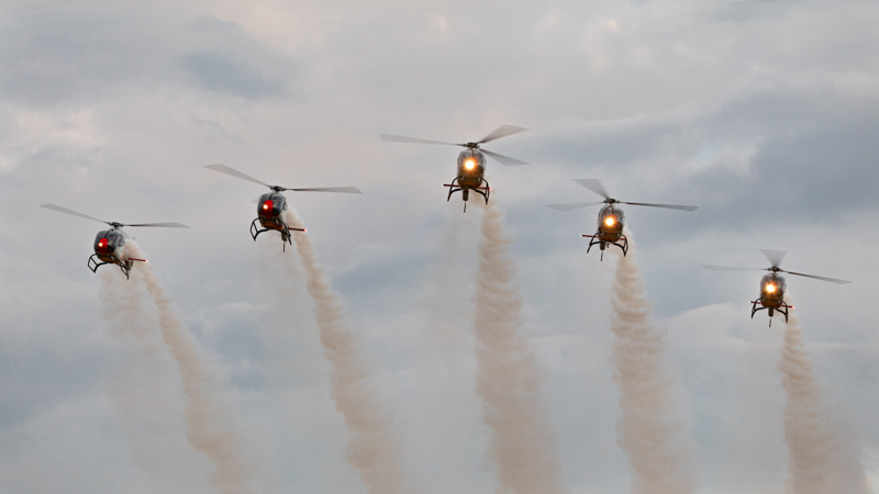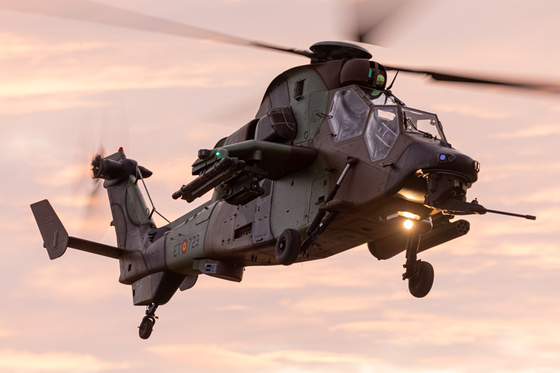 Las luces del día se van apagando y la Patrulla Aspa arranca motores y se eleva suavemente sobre la plataforma de Alguaire para tomar posiciones y comenzar su exhibición. Durante más de veinte minutos estos pilotos del Ejército del Aire demuestran por qué Aspa se ha convertido en una de las patrullas de helicópteros de referencia en Europa. Cuando aún no se han parado los motores de los HE-25 Colibrí comienza su exhibición el HA-28 Tigre del Batallón de Helicópteros de Ataque I de Almagro. La tripulación del Tigre realiza una tabla que demuestra las capacidades de este helicóptero en servicio en numerosos ejército europeos.