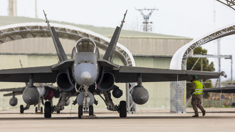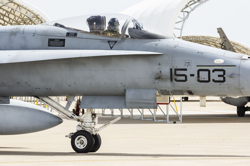 La actividad en la plataforma de Ala 15 es frenética, el personal de tierra trabaja laboriosamente alrededor de sus EF-18, dentro de unos minutos se van a lanzar aviones al aire, destino: Frisian Flag 2018.