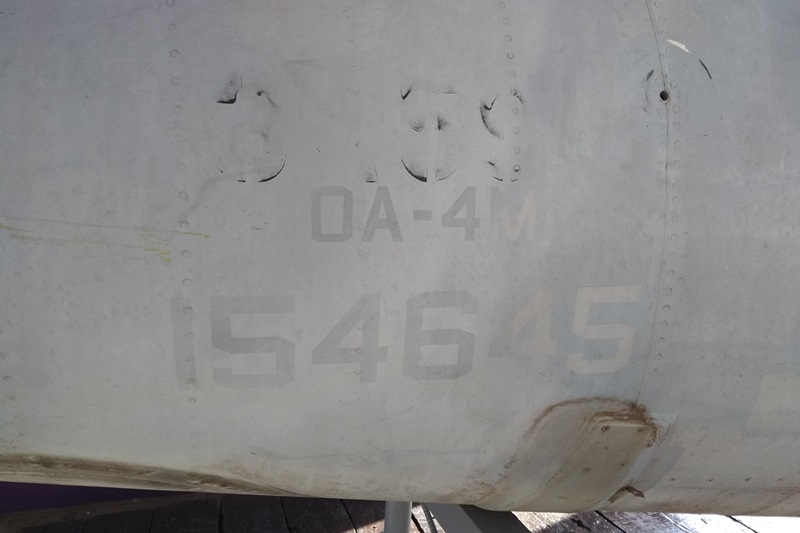 Hasta el momento no se ha elegido el lugar donde se realizará el monumento y como fue cedida sin pintar, se puede notar que fue reacondicionada con partes de A-4AR y apreciar todavía su Bureau Number, el 154645. Esto nos indica que fue el TA-4F, manufacturer serial number 13763, salido de la fábrica de McDonnell Douglas en Long Beach (Estado de California) en 1968 y que en mayo del ‘80 fuera convertido en OA-4M.