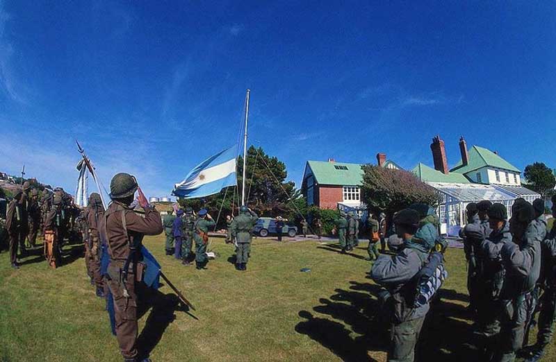 Primer acto oficial del izamiento de la bandera argentina en Puerto Argentino Aproximadamente a eso de las 10 de la mañana del 2 de abril, el Brigadier Castellano me ordenó que con un Suboficial de Comunicaciones me dirija a la ciudad para un acto, donde por primera vez se iba a izar la bandera argentina después de la usurpación inglesa. Fácil es decirlo, pero muy difícil de concretarlo, ya que nosotros no teníamos vehículos, nuestra misión era solo estar en la Isla 48 horas y brindar las comunicaciones para un óptimo funcionamiento del aeropuerto, no teníamos previsto ningún