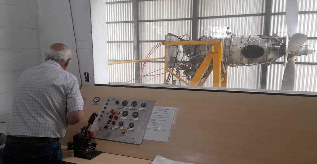 Gustosamente me mostró las instalaciones del taller de ensayo de motores a reacción, muy bien acondicionado, con sectores de seguridad y señalización acordes, con salas de pruebas de motores equipadas con tableros de instrumentos de medición de los motores bajo prueba, y mandos de control de potencia. Pude tener el honor de presenciar la puesta en marcha de un motor PT6A-20, montado en un banco de pruebas, además de un microturbo (motor de arranque).