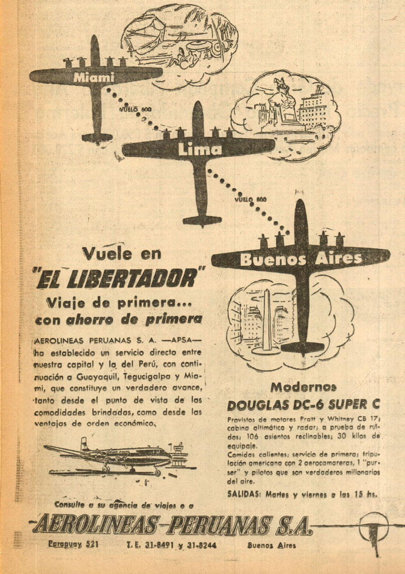 El pasajero argentino que quería volar a otros destinos de América debía hacer combinaciones diversas. Las líneas norteamericanas (Braniff, Panagra y Pan American) tenían una cobertura bastante amplia: Braniff unía Buenos Aires con Asunción, La Paz, Lima, Guayaquil, Panamá, La Habana y Estados Unidos, incluyendo vuelos domésticos en ese país (ver Braniff (II): Toda la política aerocomercial norteamericana en un diminuto pie de página), Panagra con Santiago, Lima, La Paz, Guayaquil, Panamá y Miami, y Pan American con Montevideo, Río de Janeiro, Puerto España y Nueva York. Todos tenían combinaciones diversas dentro del continente, que permitían llegar a más destinos, como México, Bogotá, San Juan, etcétera.