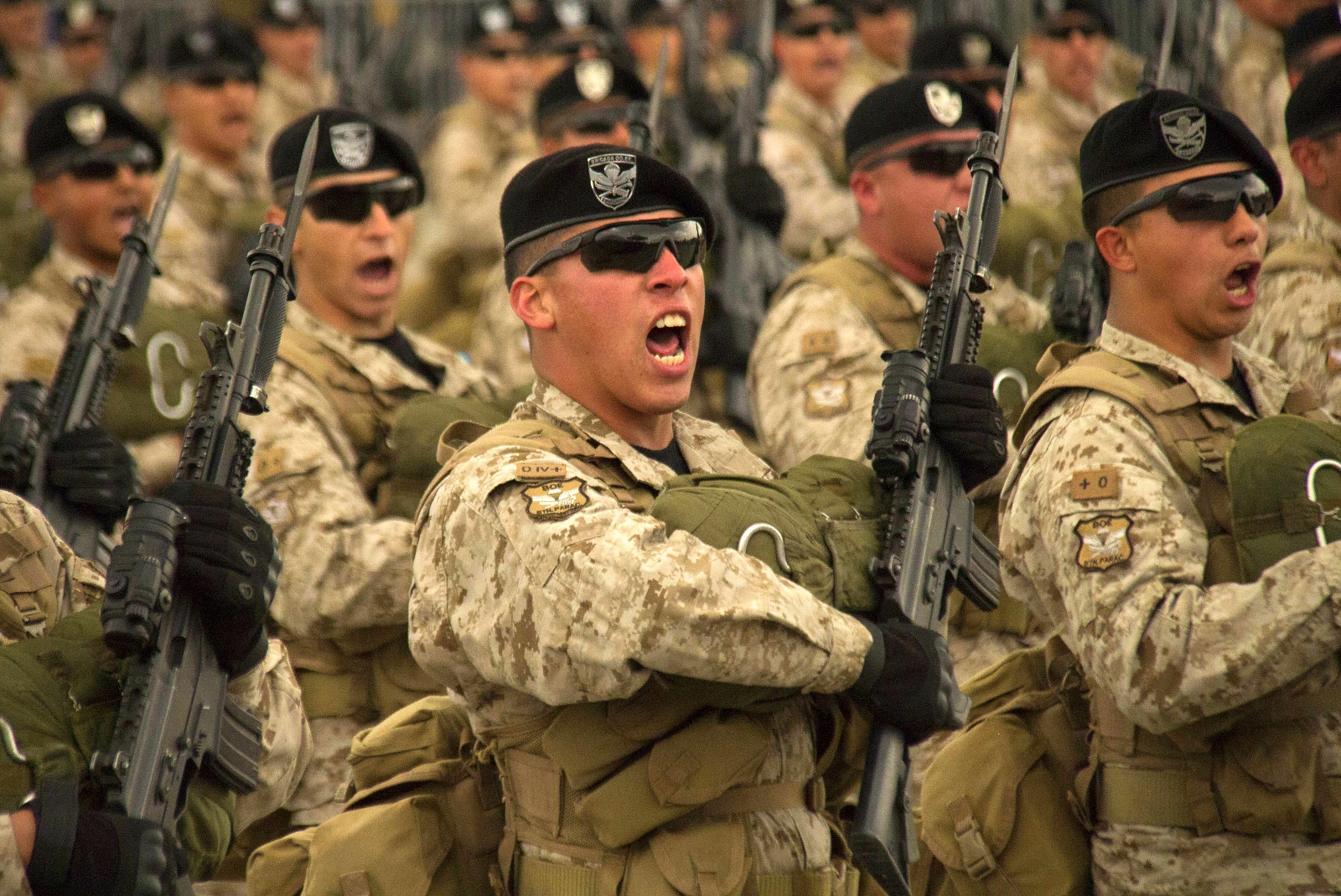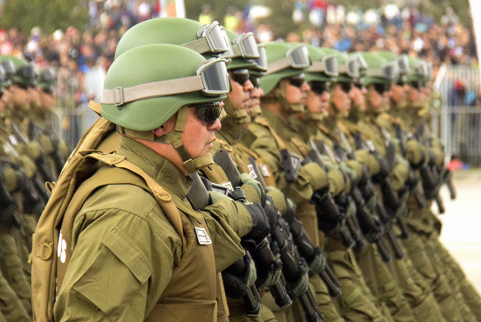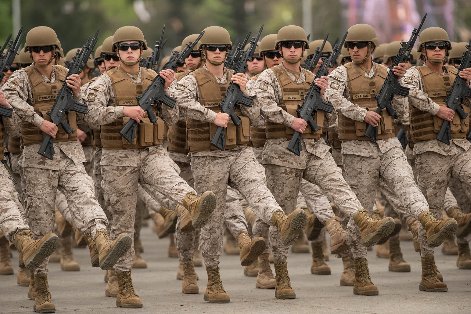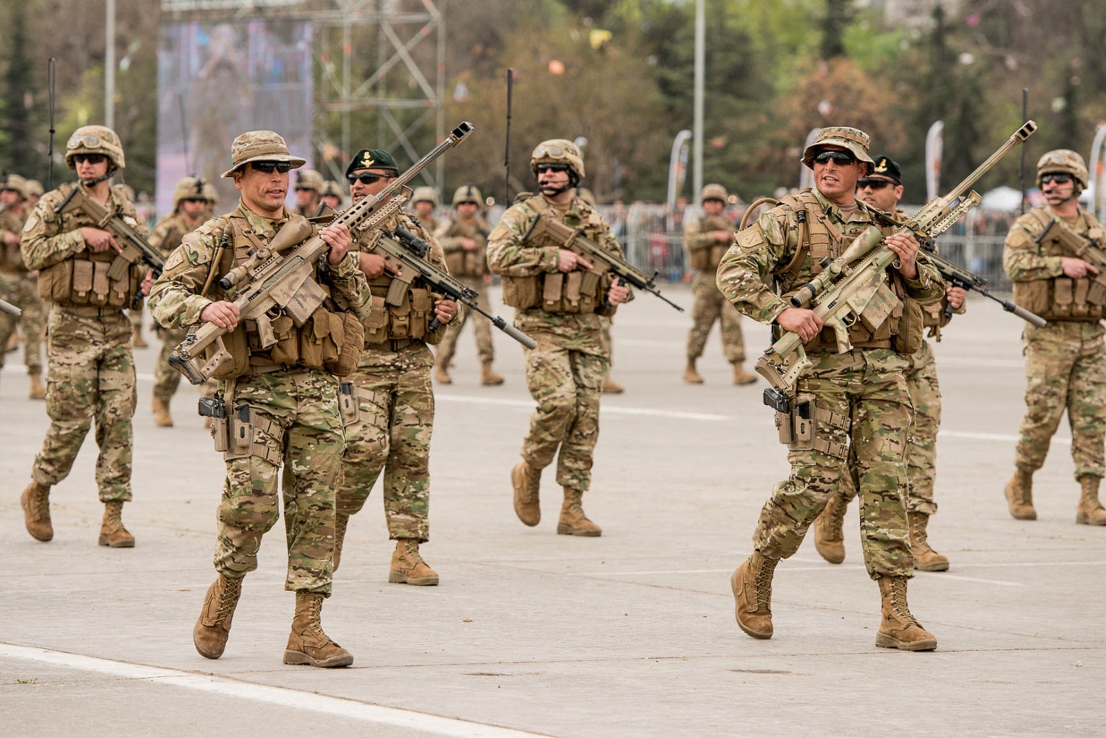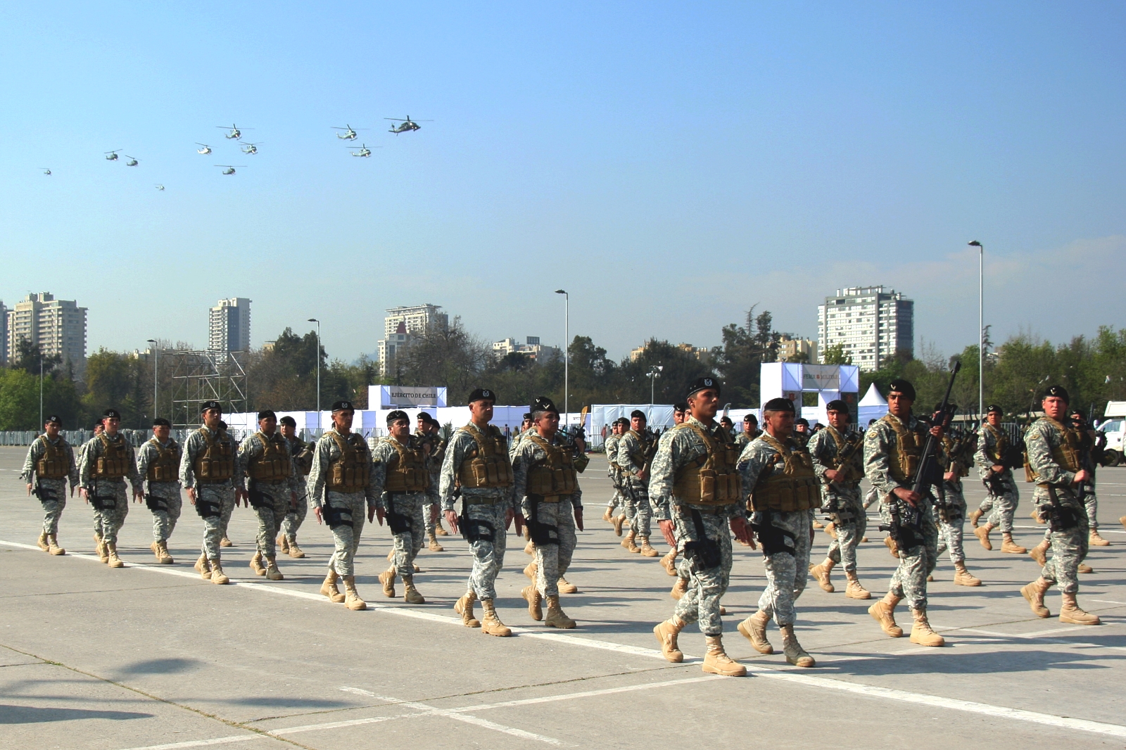 Buena parte de las tropas en exhibición lucían las más recientes adquisiciones del Ejército: Cascos tácticos de Kevlar (30% mas livianos que sus predecesores, capaces de resistir impactos de munición 9 mm y S&W .40 o fragmentos de granada y mortero y aptos para la instalación de visores nocturnos), protección balística corporal y fusiles de asalto IMI Galil calibre 5,56 mm de origen israelí.