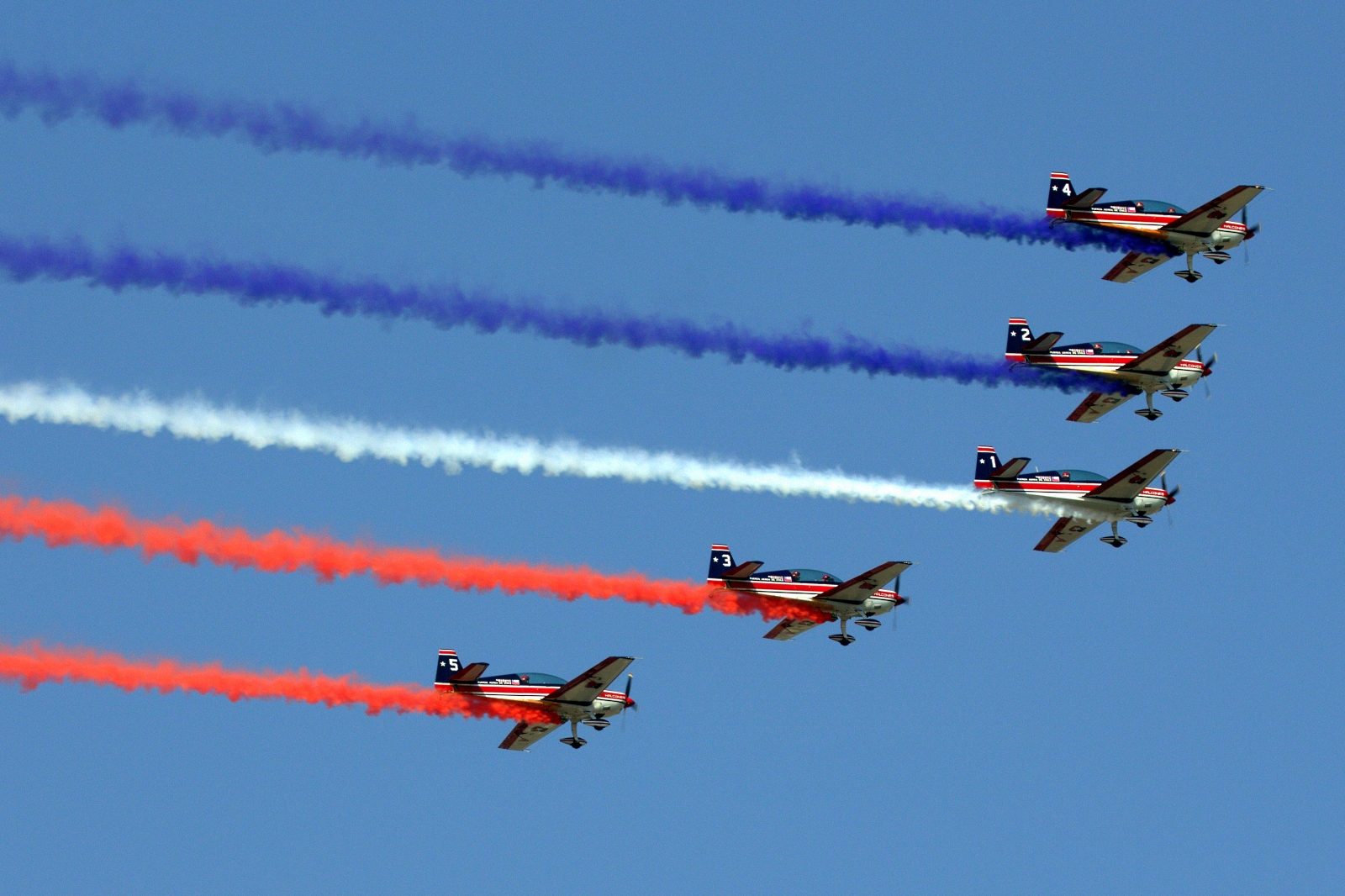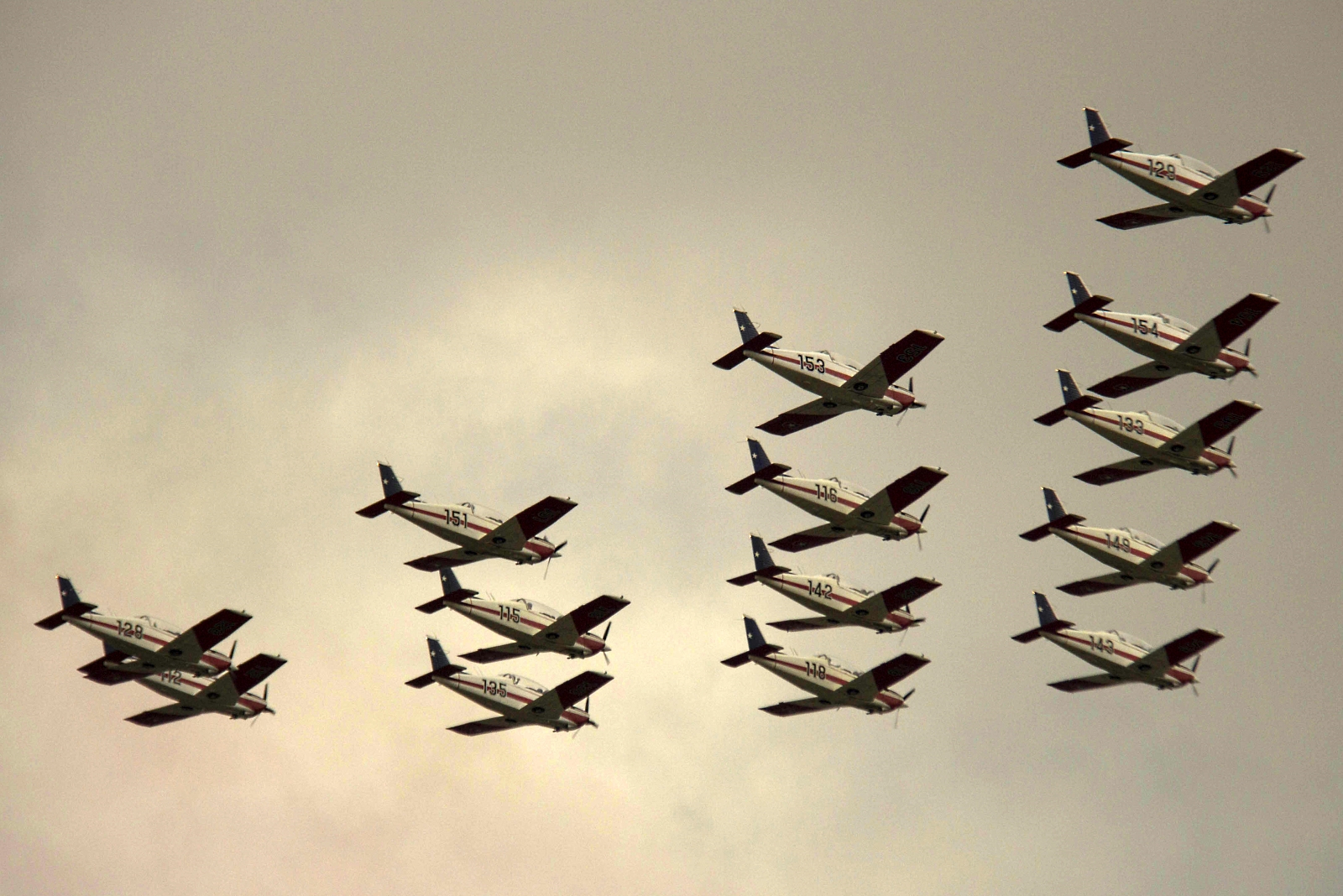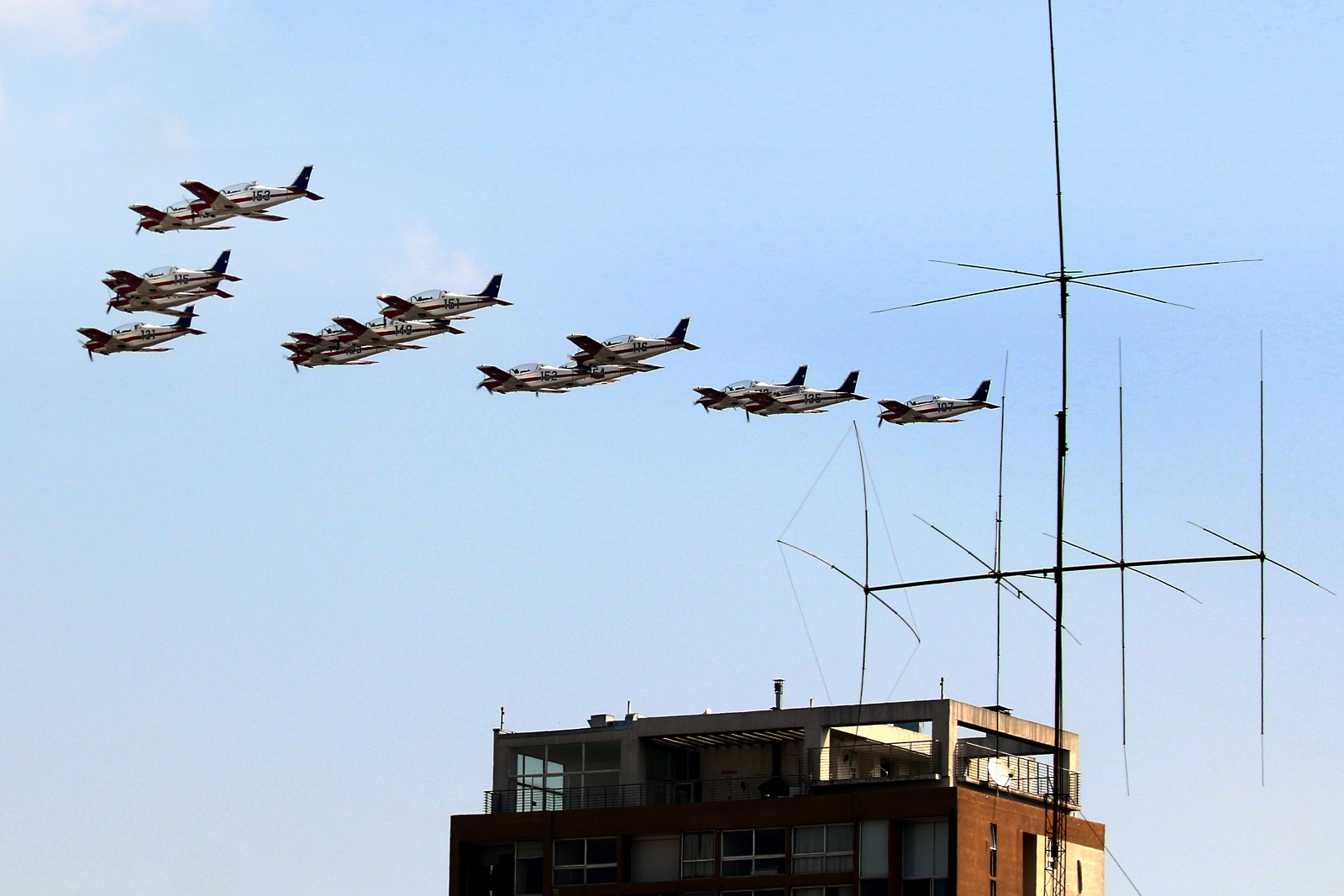 Al paso de la Escuela de Aviación, se hicieron presentes en cielo santiaguino los cinco Extra EA300L de la escuadrilla de alta acrobacia “Halcones”, al mando del capitán Joseph Suez Pavic, y 15 entrenadores T-35 Pillán de la propia academia, conducidos por el comandante de escuadrilla Ricardo Salazar Schiaffino.