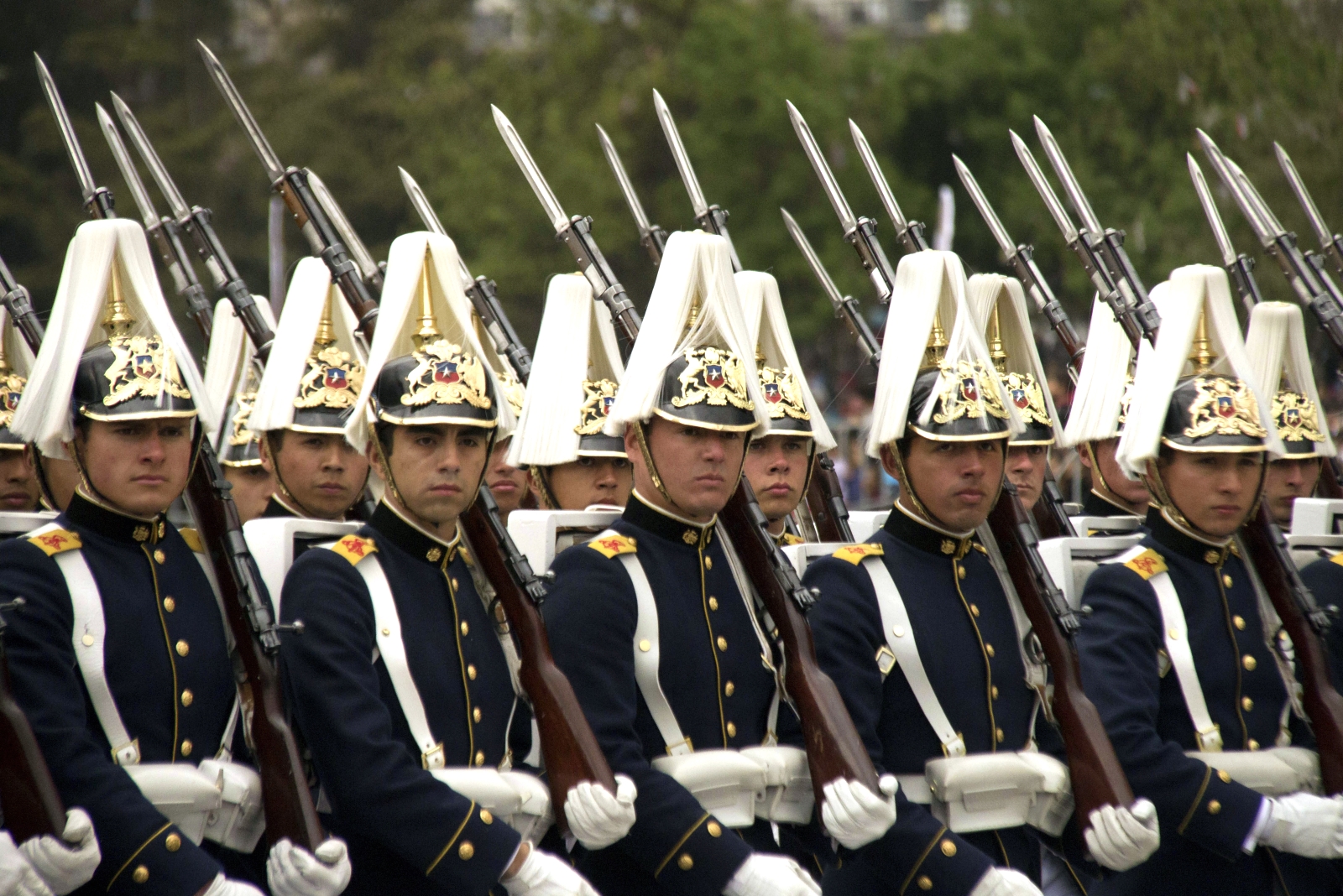 Diez minutos antes que dieran las 15:00 horas, Bachelet inició la revista las escuelas matrices de las cuatro fuerzas armadas y de seguridad formadas en la elipse escoltada por el Regimiento Escolta Presidencial Nº 1 “Granaderos”.