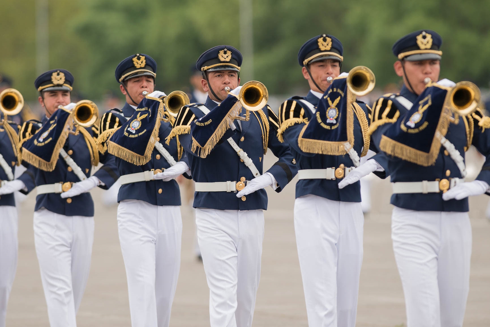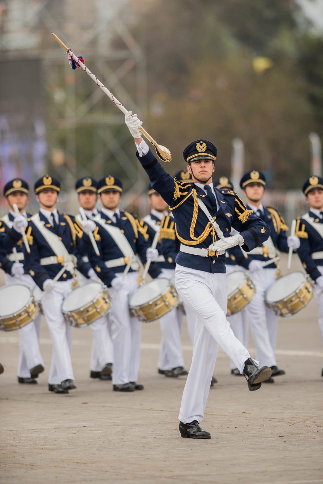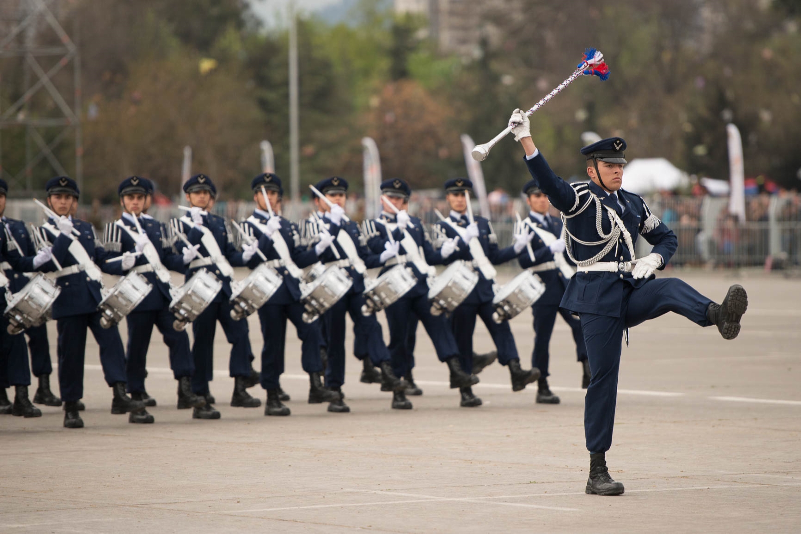 El escalón completo desfiló al son de la marcha “Viejos Camaradas” ejecutada por la Banda de Guerra e Instrumental de la Escuela de Especialidades y fue acompañado desde el aire por un subescalón aéreo de sólo dos elementos que sobrevoló el Parque O’Higgins bajo la conducción del comandante de grupo Alfredo Ríos Latorre.