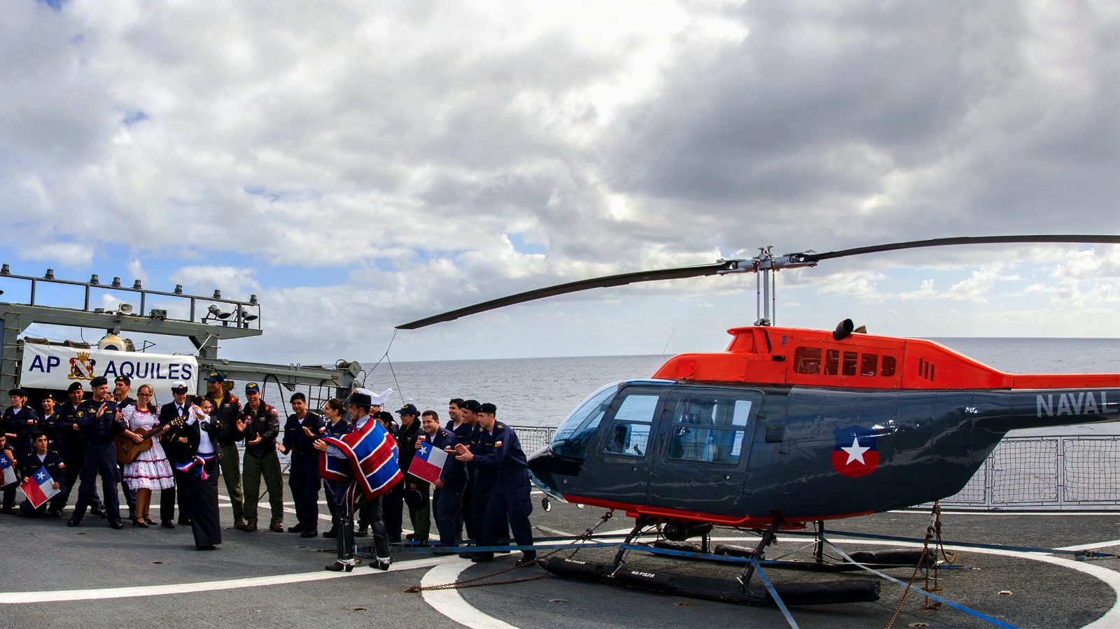 Se trata de un Bell JetRanger III que, embarcado en el transporte “Aquiles” de la Armada de Chile, sirvió de marco estático para las actividades recreativas con las que los 145 tripulantes del buque celebraron el aniversario patrio en plena navegación entre Isla de Pascua y Valparaíso.