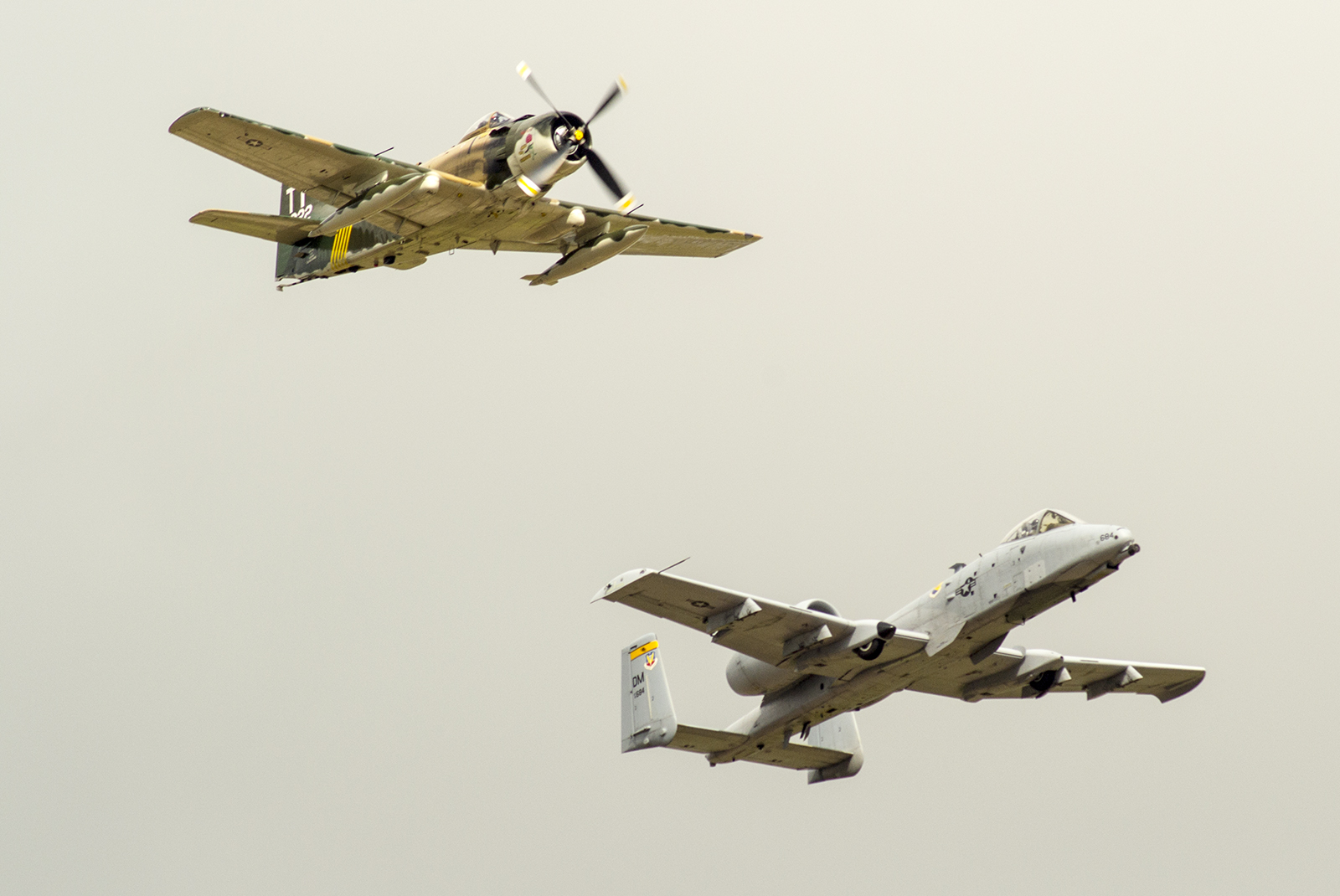 Dos clásicos cañoneros de la aviación militar norteamericana sobrevuelan Ellington Airport bajo un cielo plomizo: Un A-1 Skyraider de la Guerra de Vietnam y un A-10 Warthog de fines de la Guerra Fría (foto: Javier Vera Martínez).