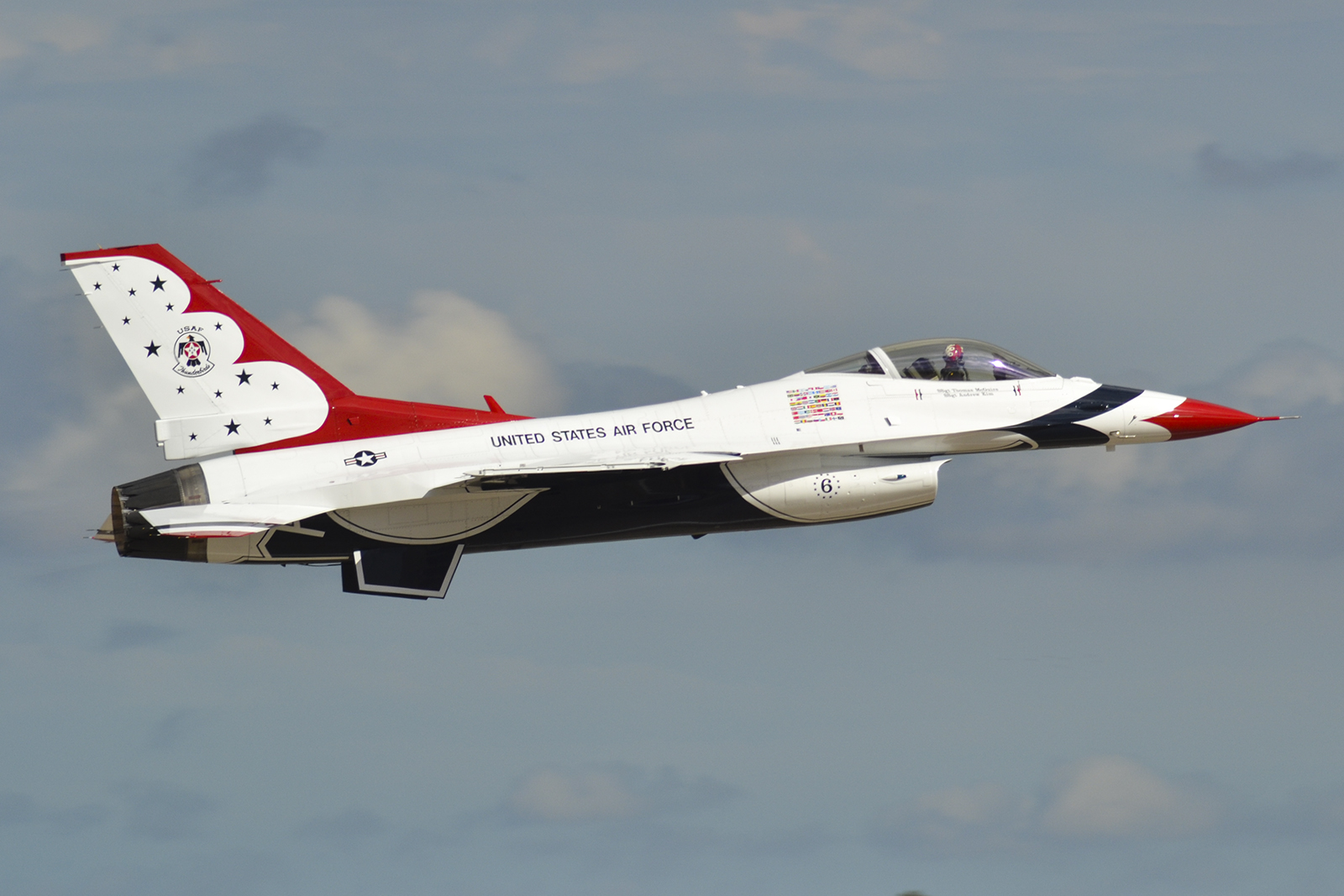 El primer solista de los Thunderbirds luce el número seis (6) en su fuselaje (foto: Javier Vera Martínez).