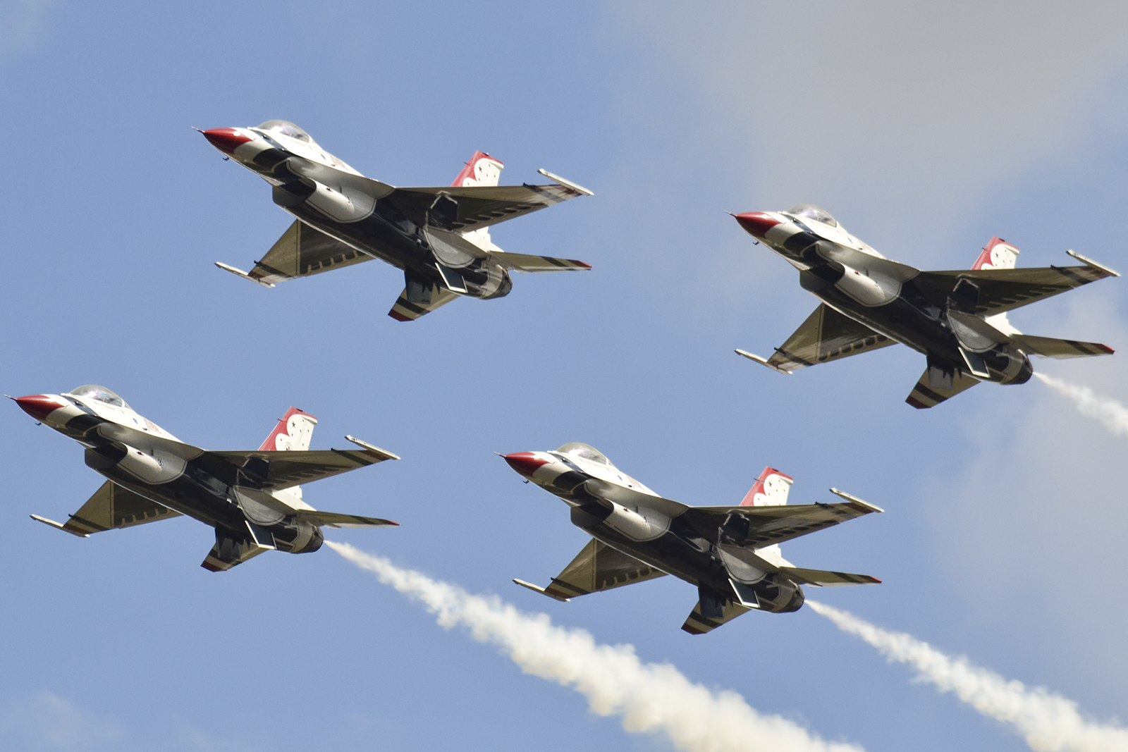 Vistos en pleno viraje en formación clásica, los Thunderbirds ilustran el isotipo de las aves que les dan nombre (foto: Javier Vera Martínez).