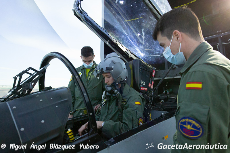 Una vez realizada la toma de contacto inicial con los componentes del equipo y realizada la comprobación previa de funcionamiento, los tres pilotos se dirigen al edificio del simulador del Ala 15 para comprobar la operación básica del sistema. El simulador que actualmente está en servicio en el Ala 15 poco tiene que ver con la versión inicial que construyó la empresa española Ceselsa allá por los años 80, actualmente el simulador ubicado en la base de Zaragoza tiene unas características, capacidades e interface visual que permiten dar a los pilotos una formación en simulador de máxima calidad.
