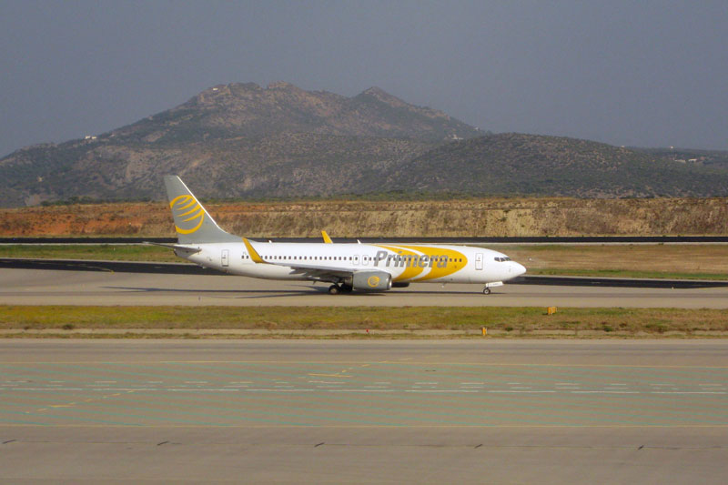 Diágoras dispone de una pista con orientación 07-25 de 3300 metros de longitud y está abierto las 24 horas del día.