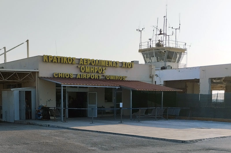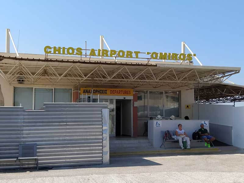 El Aeropuerto Nacional de Chíos (JKH/LGHI) se encuentra en la zona costera de Kampos, justo 3 km al sur de la capital de la isla. Sus operaciones comenzaron el 4 de agosto de 1969 con un vuelo procedente de Atenas. Desde entonces, ha sido objeto de varias renovaciones y mejoras para satisfacer la creciente demanda turística. En el verano de 2023 afrontaba una nueva renovación y ampliación.