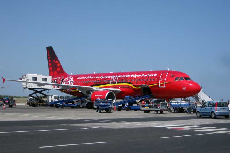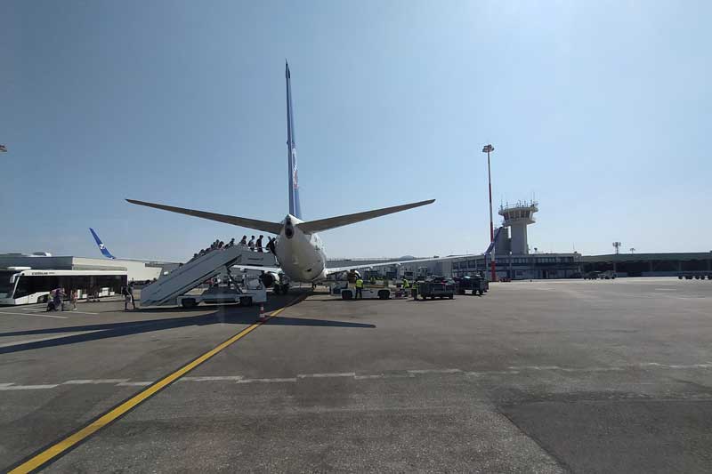 El ascenso y descenso de las aeronaves se realiza directamente a pie o mediante el clásico sistema de autobuses. No hay fingers.