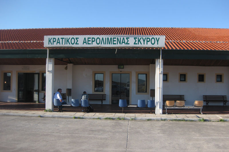El aeropuerto civil (SKU/LGSY) está ubicado dentro de la misma base aérea, y todas las infraestructuras se hallan en una zona llamada Trachi, a 17 km hacia el norte de la capital isleña, también llamada Skyros. Se inauguró en 1984 y desde entonces funciona como aeropuerto civil, pero dentro de la base militar de la HAF. Esto implica que hay control de acceso por parte de personal militar a la hora de entrar o salir del predio, aunque no representa mayores obstáculos para los portadores de un pasaje aéreo que se dirigen a la pequeña terminal.