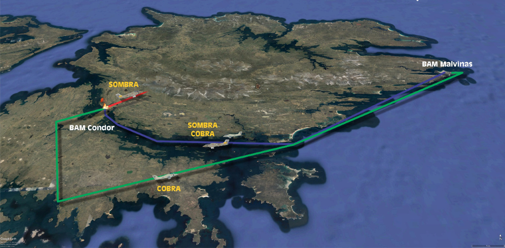 Según testimonios de Címbaro y del entonces suboficial auxiliar Norberto Basáez, especialista en comunicaciones e integrante del equipo director de tiro de la BAM Cóndor, la sección navegó visualmente rumbo al istmo reportando posición a la entrada del Seno de Choiseul (punto “Alfa”) y 8 km. al sudeste del aeródromo de Prado del Ganso (punto “Bravo”) mientras mantenían contacto permanente con Basáez, quien desde una ventajosa ubicación al sureste del pueblo de Goose Green tenía a la vista tanto los aviones como el campo de combate.